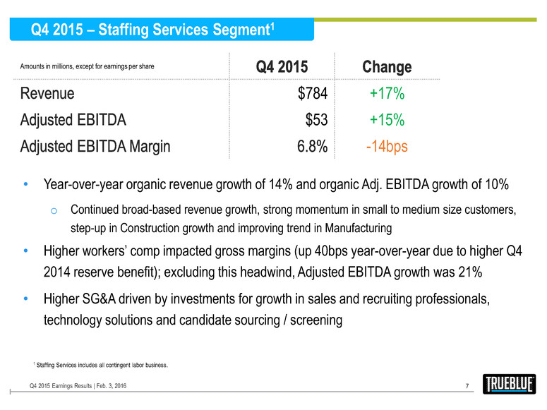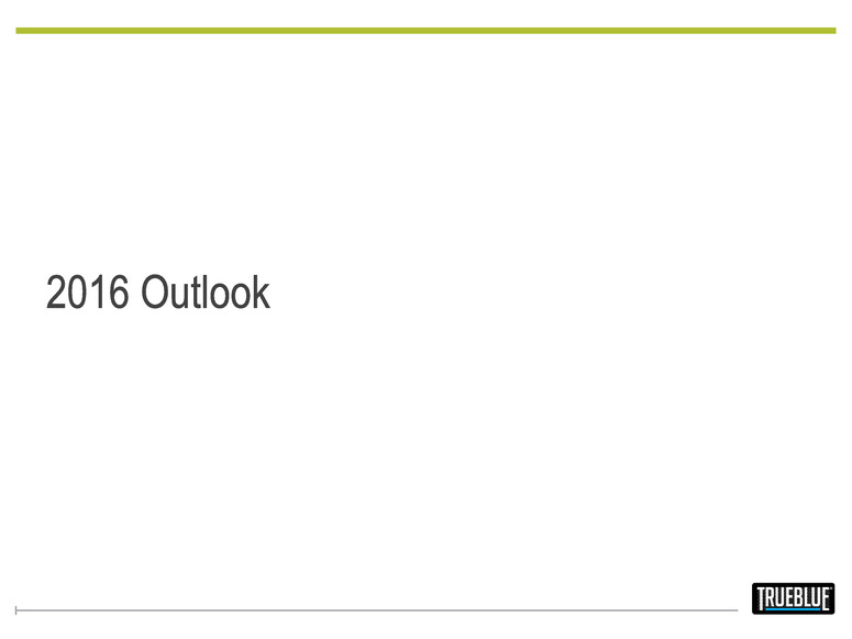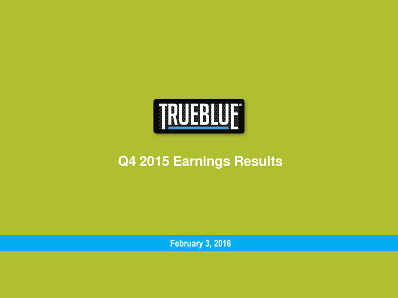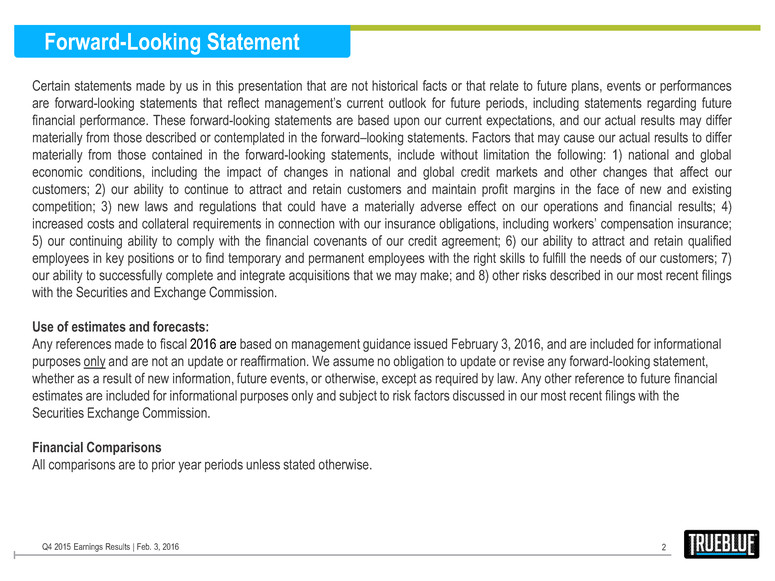 Forward-Looking Statement Certain statements made by us in this presentation that are not historical facts or that relate to future plans, events or performances are forward-looking statements that reflect management’s current outlook for future periods, including statements regarding future financial performance. These forward-looking statements are based upon our current expectations, and our actual results may differ materially from those described or contemplated in the forward–looking statements. Factors that may cause our actual results to differ materially from those contained in the forward-looking statements, include without limitation the following: 1) national and global economic conditions, including the impact of changes in national and global credit markets and other changes that affect our customers; 2) our ability to continue to attract and retain customers and maintain profit margins in the face of new and existing competition; 3) new laws and regulations that could have a materially adverse effect on our operations and financial results; 4) increased costs and collateral requirements in connection with our insurance obligations, including workers’ compensation insurance; 5) our continuing ability to comply with the financial covenants of our credit agreement; 6) our ability to attract and retain qualified employees in key positions or to find temporary and permanent employees with the right skills to fulfill the needs of our customers; 7) our ability to successfully complete and integrate acquisitions that we may make; and 8) other risks described in our most recent filings with the Securities and Exchange Commission. Use of estimates and forecasts: Any references made to fiscal 2016 are based on management guidance issued February 3, 2016, and are included for informational purposes only and are not an update or reaffirmation. We assume no obligation to update or revise any forward-looking statement, whether as a result of new information, future events, or otherwise, except as required by law. Any other reference to future financial estimates are included for informational purposes only and subject to risk factors discussed in our most recent filings with the Securities Exchange Commission. Financial Comparisons All comparisons are to prior year periods unless stated otherwise. Q4 2015 Earnings Results | Feb. 3, 2016 2