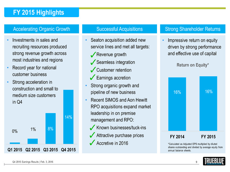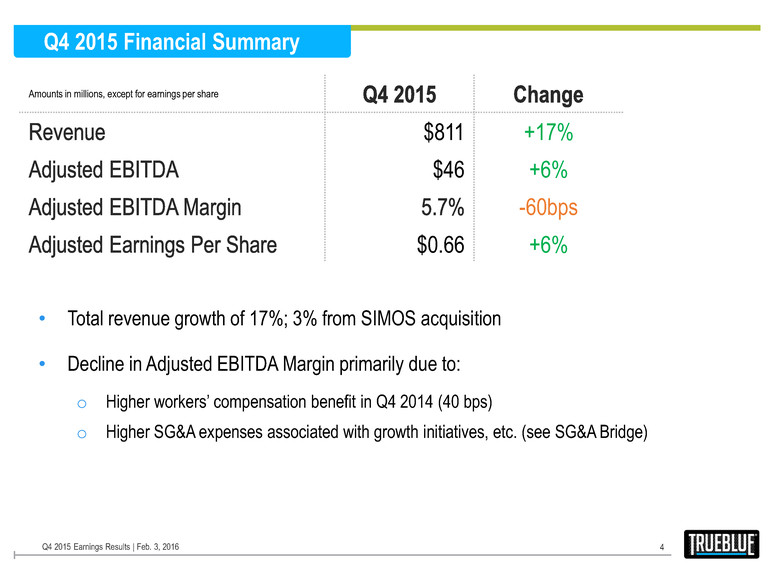 Q4 2015 Growth Highlights • Organic growth accelerated to 14% vs. 8% in Q3 2015 o Construction – double-digit growth o Small to medium size customers – mid-single digit growth vs. flat Q3 2015 o On-premise – acceleration in double-digit growth trend o National customers –double-digit growth, slower growth at end of quarter o Manufacturing – low-single digit decline vs. high single-digit decline Q3 2015 • Completed two acquisitions1 expanding capabilities in on-premise management and recruitment process outsourcing • Renewal of WOTC2 reduces expected income tax rate from 38% to 32% for the next four years; Adjusted EBITDA3 and Adjusted EPS3 calculations have been modified: 1. Both measures now exclude WOTC processing fees, and 2. Adjusted EPS uses the new expected income tax rate of 32% 3 Q4 2015 Earnings Results | Feb. 3, 2016 1 SIMOS Insourcing Solutions acquired on December 1, 2015. Aon Hewitt RPO purchase agreement signed December 2015, but closed January 4, 2016. 2 Protecting Americans From Tax Hikes Act of 2015 extended the Work Opportunity Tax Credit (WOTC) retroactively from January 1, 2015 through December 31, 2019. 3 See Appendix for definitions of non-GAAP financial terms.