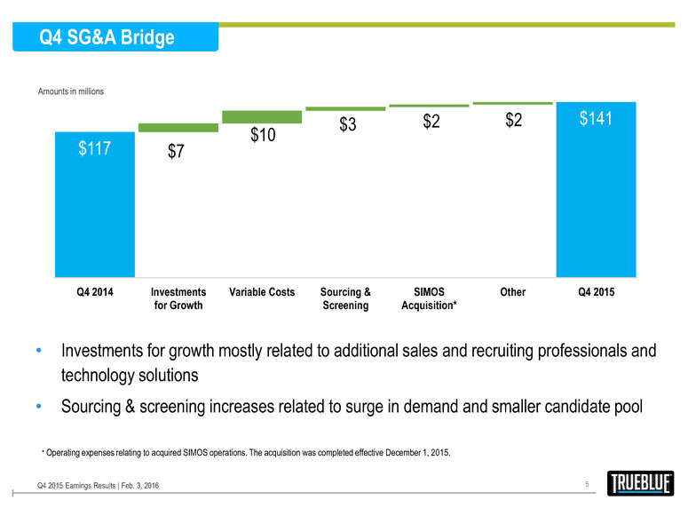 Q4 2015 Financial Summary 4 Amounts in millions, except for earnings per share $811 +17% $46 +6% -60bps $0.66 +6% • Total revenue growth of 17%; 3% from SIMOS acquisition • Decline in Adjusted EBITDA Margin primarily due to: o Higher workers’ compensation benefit in Q4 2014 (40 bps) o Higher SG&A expenses associated with growth initiatives, etc. (see SG&A Bridge) Q4 2015 Earnings Results | Feb. 3, 2016