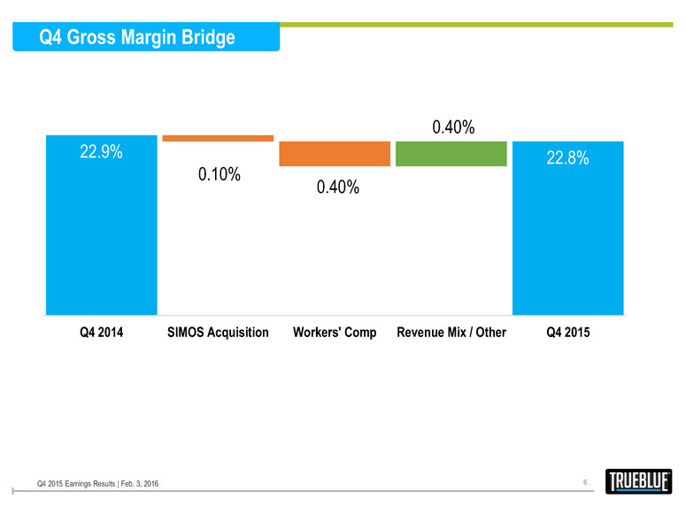 5 Q4 SG&A Bridge $117 $141 $7 $10 $3 $2 $2 Q4 2014 Investments for Growth Variable Costs Sourcing & Screening SIMOS Acquisition* Other Q4 2015 • Investments for growth mostly related to additional sales and recruiting professionals and technology solutions • Sourcing & screening increases related to surge in demand and smaller candidate pool Q4 2015 Earnings Results | Feb. 3, 2016 * Operating expenses relating to acquired SIMOS operations. The acquisition was completed effective December 1, 2015. Amounts in millions