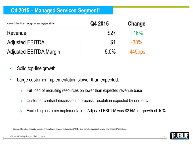 Q4 2015 – Staffing Services Segment1 7 Amounts in millions, except for earnings per share $784 +17% $53 +15% -14bps • Year-over-year organic revenue growth of 14% and organic Adj. EBITDA growth of 10% o Continued broad-based revenue growth, strong momentum in small to medium size customers, step-up in Construction growth and improving trend in Manufacturing • Higher workers’ comp impacted gross margins (up 40bps year-over-year due to higher Q4 2014 reserve benefit); excluding this headwind, Adjusted EBITDA growth was 21% • Higher SG&A driven by investments for growth in sales and recruiting professionals, technology solutions and candidate sourcing / screening Q4 2015 Earnings Results | Feb. 3, 2016 1 Staffing Services includes all contingent labor business.
