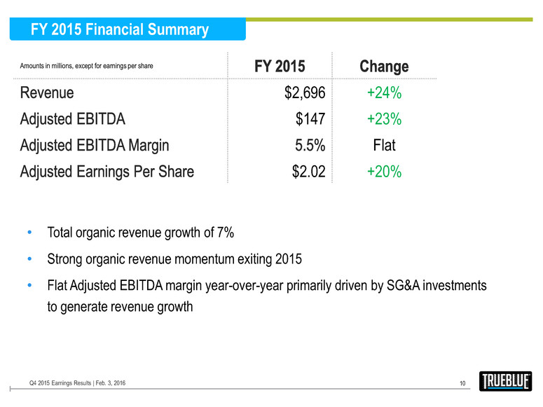 0% 1% 8% 14% Q1 2015 Q2 2015 Q3 2015 Q4 2015 FY 2015 Highlights 9 Q4 2015 Earnings Results | Feb. 3, 2016 Accelerating Organic Growth Successful Acquisitions Strong Shareholder Returns • Investments in sales and recruiting resources produced strong revenue growth across most industries and regions • Record year for national customer business • Strong acceleration in construction and small to medium size customers in Q4 • Seaton acquisition added new service lines and met all targets: Revenue growth Seamless integration Customer retention Earnings accretion • Strong organic growth and pipeline of new business • Recent SIMOS and Aon Hewitt RPO acquisitions expand market leadership in on premise management and RPO: Known businesses/tuck-ins Attractive purchase prices Accretive in 2016 • Impressive return on equity driven by strong performance and effective use of capital 16% 16% FY 2014 FY 2015 Return on Equity* *Calculated as Adjusted EPS multiplied by diluted shares outstanding and divided by average equity from annual balance sheets.