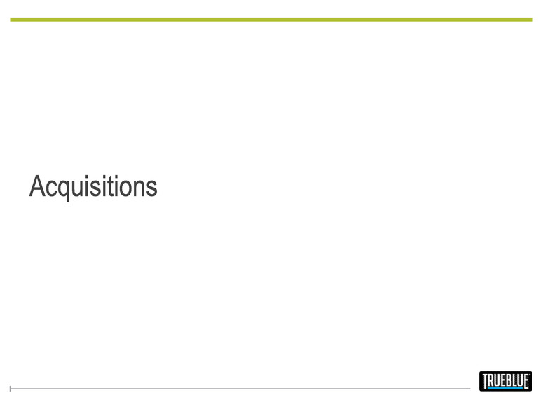 0% 8% 30% 18% 31% 30% 2012 2013 2014 Q3 2015 Q4 2015 Jan-16* -$130 -$105 $180 $91 $214 $192 No Debt $32 $202 $114 $246 $236 2012 2013 2014 Q3 2015 Q4 2015 Jan-16* Cash Net Debt Total Debt Liquidity Debt to Total Capital Amounts in millions Amounts in millions 11 *Jan-16 includes debt for the acquisition of Aon Hewitt’s RPO division. December is peak working-capital month for TrueBlue, hence Aon Hewitt acquisition debt is offset by seasonal de-leveraging. Borrowing availability based on management estimates. Debt and Liquidity Highlights $73 $74 $101 $201 $77 $65 $130 $137 $21 $23 $32 $44 $202 $211 $123 $224 $109 $109 2012 2013 2014 Q3 2015 Q4 2015 Jan-16* Cash Borrowing Availability Q4 2015 Earnings Results | Feb. 3, 2016 Note: Balances as of fiscal period end. Figures on this page may not sum due to rounding.