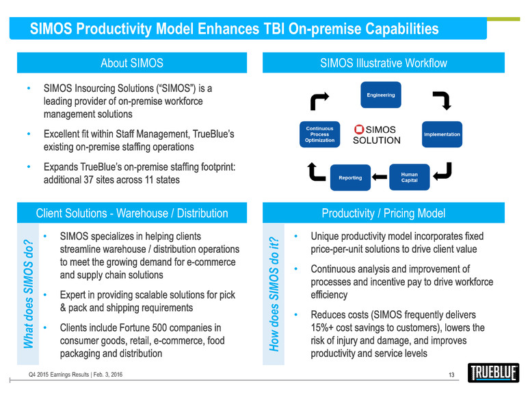 SIMOS Productivity Model Enhances TBI On-premise Capabilities 13 Q4 2015 Earnings Results | Feb. 3, 2016 • • • About SIMOS SIMOS Illustrative Workflow Client Solutions - Warehouse / Distribution Productivity / Pricing Model • • • • • • W h at d o es SI M O S d o ? Ho w d o es SI M O S d o it ?