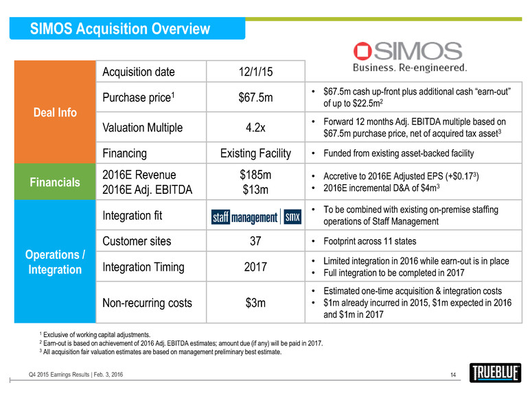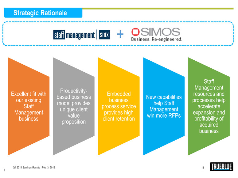 SIMOS Acquisition Overview 14 Q4 2015 Earnings Results | Feb. 3, 2016 Deal Info Acquisition date 12/1/15 Purchase price1 $67.5m • $67.5m cash up-front plus additional cash “earn-out” of up to $22.5m2 Valuation Multiple 4.2x • Forward 12 months Adj. EBITDA multiple based on $67.5m purchase price, net of acquired tax asset3 Financing Existing Facility • Funded from existing asset-backed facility Financials 2016E Revenue 2016E Adj. EBITDA $185m $13m • Accretive to 2016E Adjusted EPS (+$0.173) • 2016E incremental D&A of $4m3 Operations / Integration Integration fit • To be combined with existing on-premise staffing operations of Staff Management Customer sites 37 • Footprint across 11 states Integration Timing 2017 • Limited integration in 2016 while earn-out is in place • Full integration to be completed in 2017 Non-recurring costs $3m • Estimated one-time acquisition & integration costs • $1m already incurred in 2015, $1m expected in 2016 and $1m in 2017 1 Exclusive of working capital adjustments. 2 Earn-out is based on achievement of 2016 Adj. EBITDA estimates; amount due (if any) will be paid in 2017. 3 All acquisition fair valuation estimates are based on management preliminary best estimate.