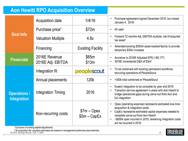 Aon Hewitt RPO Acquisition Advances PeopleScout’s Global Strategy 16 Q4 2015 Earnings Results | Feb. 3, 2016 • business is a leading provider of recruitment process outsourcing (RPO) services • • • • About Aon Hewitt RPO Domestic v. International One Global PeopleScout Aon Hewitt Partnership • • • • 88% 60% 12% 40% Client Placements Employees Domestic International