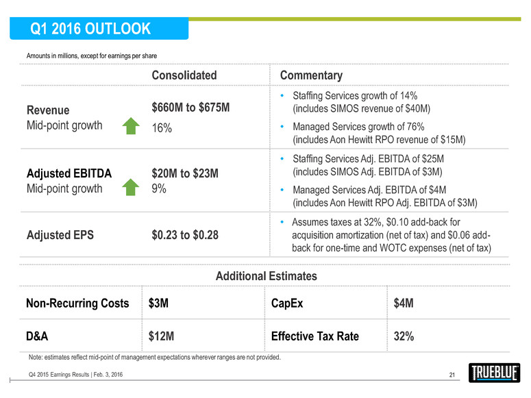 FY 2016 Highlights 20 Q4 2015 Earnings Results | Feb. 3, 2016 Investing for Growth 2016 Priorities 2016 Outlook • Sales and recruiting headcount added in the back half of 2015. Year-over-year SG&A growth rates expected to moderate throughout 2016. • New SG&A investments added in mobile technology for contingent employees in Q4 2015 and will continue in 2016. Revenue and expense benefits expected in the back half of 2016. • Slower growth trends in January 2016 with national customers, the retail and construction industries. • Top priority is strong, profitable organic growth • Make significant advancements in the use of mobile technology within our staffing businesses • Harness the benefit of 2015 investments and 2016 technology investments to drive progressively higher operating leverage throughout 2016. • Successfully integrate acquisitions. • Expect total annual revenue growth of roughly 15% including organic growth of 8%. • Expect total annual Adjusted EBITDA of $190M, or growth of about 30%. Expected Adjusted EPS of roughly $2.65. Strong, prof table organic growth. • Increase Adj. EBITDA margin by scaling operating expenses down to match demand and leveraging technology. • Make significant advancements in the use of mobile technology within our staffing businesses. • Successfully integrate acquisitions.