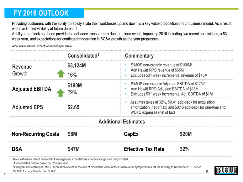 Consolidated Commentary Revenue Mid-point growth $660M to $675M 16% • Staffing Services growth of 14% (includes SIMOS revenue of $40M) • Managed Services growth of 76% (includes Aon Hewitt RPO revenue of $15M) Adjusted EBITDA Mid-point growth $20M to $23M 9% • Staffing Services Adj. EBITDA of $25M (includes SIMOS Adj. EBITDA of $3M) • Managed Services Adj. EBITDA of $4M (includes Aon Hewitt RPO Adj. EBITDA of $3M) Adjusted EPS $0.23 to $0.28 • Assumes taxes at 32%, $0.10 add-back for acquisition amortization (net of tax) and $0.06 add- back for one-time and WOTC expenses (net of tax) Amounts in millions, except for earnings per share Q1 2016 OUTLOOK 21 Q4 2015 Earnings Results | Feb. 3, 2016 Additional Estimates Non-Recurring Costs $3M CapEx $4M D&A $12M Effective Tax Rate 32% Note: estimates reflect mid-point of management expectations wherever ranges are not provided.