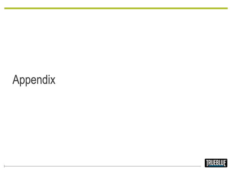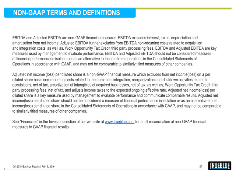 EBITDA and Adjusted EBITDA are non-GAAP financial measures. EBITDA excludes interest, taxes, depreciation and amortization from net income. Adjusted EBITDA further excludes from EBITDA non-recurring costs related to acquisition and integration costs, as well as, Work Opportunity Tax Credit third party processing fees. EBITDA and Adjusted EBITDA are key measures used by management to evaluate performance. EBITDA and Adjusted EBITDA should not be considered measures of financial performance in isolation or as an alternative to Income from operations in the Consolidated Statements of Operations in accordance with GAAP, and may not be comparable to similarly titled measures of other companies. Adjusted net income (loss) per diluted share is a non-GAAP financial measure which excludes from net income(loss) on a per diluted share basis non-recurring costs related to the purchase, integration, reorganization and shutdown activities related to acquisitions, net of tax, amortization of intangibles of acquired businesses, net of tax, as well as, Work Opportunity Tax Credit third party processing fees, net of tax, and adjusts income taxes to the expected ongoing effective rate. Adjusted net income(loss) per diluted share is a key measure used by management to evaluate performance and communicate comparable results. Adjusted net income(loss) per diluted share should not be considered a measure of financial performance in isolation or as an alternative to net income(loss) per diluted share in the Consolidated Statements of Operations in accordance with GAAP, and may not be comparable to similarly titled measures of other companies. See “Financials” in the Investors section of our web site at www.trueblue.com for a full reconciliation of non-GAAP financial measures to GAAP financial results. NON-GAAP TERMS AND DEFINITIONS 24 Q4 2015 Earnings Results | Feb. 3, 2016