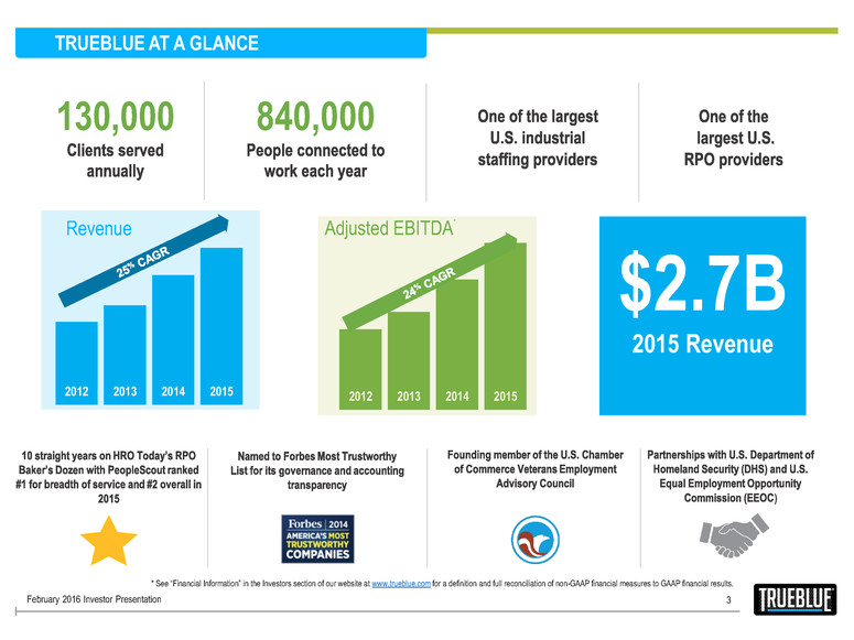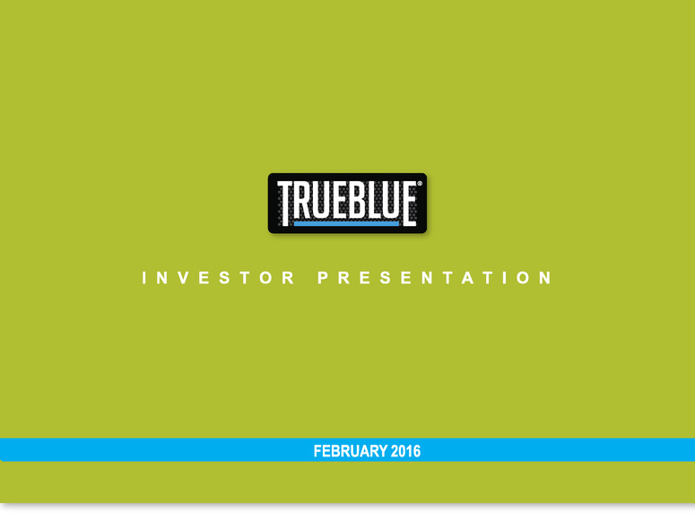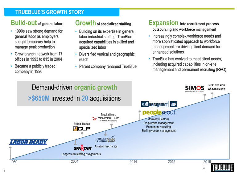 2012 2013 2014 2015 ) $2.7B 2015 Revenue 3 130,000 840,000 * See “Financial Information” in the Investors section of our website at www.trueblue.com for a definition and full reconciliation of non-GAAP financial measures to GAAP financial results. 2012 2013 2014 Revenue Adjusted EBITDA * February 2016 Investor Presentation 2012 2013 2014 2015 TRUEBLUE AT A GLANCE