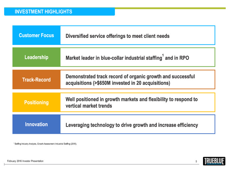 Demand-driven organic growth >$650M invested in 20 acquisitions 4 1989 Build-out • • • 2004 Growth • • • Expansion into recruitment process outsourcing and workforce • • recruiting (RPO) 2014 Longer term staffing assignments Stilled Trades Aviation mechanics Truck drivers (formerly Seaton) On-premise management Permanent recruiting Staffing vendor management 2015 TRUEBLUE’S GROWTH STORY RPO division of Aon Hewitt 2016