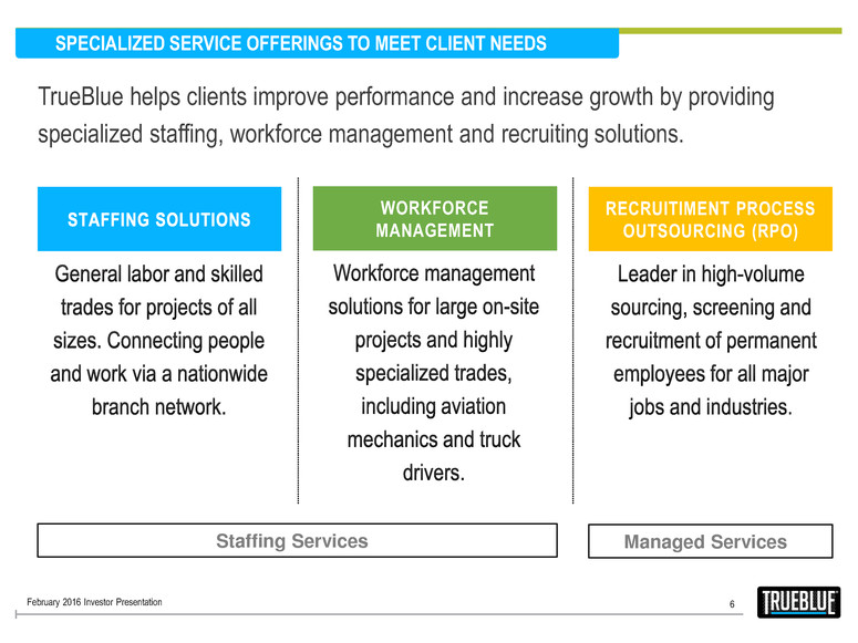 1 Staffing Industry Analysts, Growth Assessment: Industrial Staffing (2015). February 2016 Investor Presentation 5 INVESTMENT HIGHLIGHTS