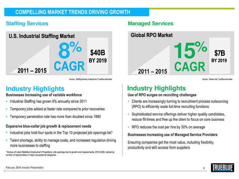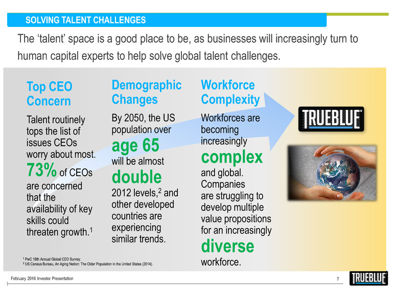 6 WORKFORCE MANAGEMENT RECRUITIMENT PROCESS OUTSOURCING (RPO) TrueBlue helps clients improve performance and increase growth by providing specialized staffing, workforce management and recruiting solutions. February 2016 Investor Presentation SPECIALIZED SERVICE OFFERINGS TO MEET CLIENT NEEDS Staffing Services Managed Services