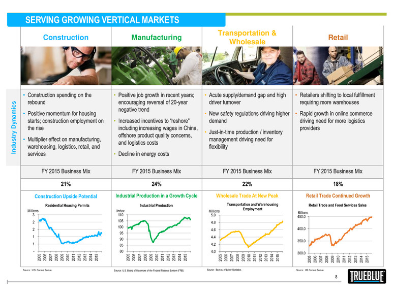 Construction Manufacturing Transportation & Wholesale Retail In d u s tr y D y n a m ic s • • • • • • • • • • • 21% 24% 22% 18% Construction Upside Potential Industrial Production in a Growth Cycle Wholesale Trade At New Peak Retail Trade Continued Growth Source: U.S. Census Bureau Source: U.S. Board of Governors of the Federal Reserve System (FRB) Source: Bureau of Labor Statistics Source: US Census Bureau 300.0 350.0 400.0 450.0 20 05 20 06 20 07 20 08 20 09 20 10 20 11 20 12 20 13 20 14 20 15 Retail Trade and Food Services Sales Billions 4.0 4.2 4.4 4.6 4.8 5.0 20 05 20 06 20 07 20 08 20 09 20 10 20 11 20 12 20 13 20 14 20 15 Transportation and Warehousing Employment Millions 80 85 90 95 100 105 110 20 05 20 06 20 07 20 08 20 09 20 10 20 11 20 12 20 13 20 14 20 15 Industrial Production Index 8 - 1 1 2 2 3 20 05 20 06 20 07 20 08 20 09 20 10 20 11 20 12 20 13 20 14 20 15 Residential Housing Permits Millions SERVING GROWING VERTICAL MARKETS