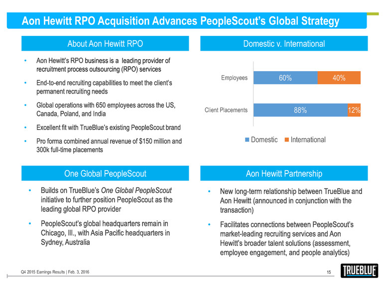 Strategic Rationale 14 Q4 2015 Earnings Results | Feb. 3, 2016 Excellent fit with our existing Staff Management business Productivity- based business model provides unique client value proposition Embedded business process service provides high client retention New capabilities help Staff Management win more RFPs Staff Management resources and processes help accelerate expansion and profitability of acquired business +