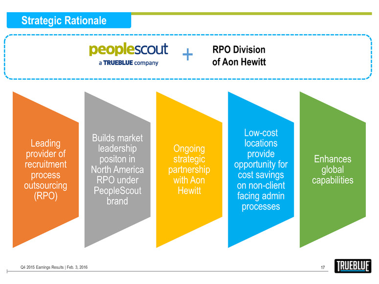 Deal Info Acquisition date 1/4/16 • Purchase agreement signed December 2015, but closed January 4, 2016. Purchase price1 $72m • All cash Valuation Multiple 4.8x • Forward 12 months Adj. EBITDA multiple, net of acquired tax asset2 Financing Existing Facility • Amended existing $300m asset-backed facility to provide temporary $30m increase Financials 2016E Revenue 2016E Adj. EBITDA $65m $13m • Accretive to 2016E Adjusted EPS (+$0.172) • 2016E incremental D&A of $3m2 Operations / Integration Integration fit • To be combined with existing permanent workforce recruiting operations of PeopleScout Annual placements 120k • >300k total combined w/ PeopleScout Integration Timing 2016 • Expect integration to be complete by year end 2016 • Transition service agreement in place with Aon Hewitt to bridge operational gaps during carve-out from Aon and full integration Non-recurring costs $7m – Opex $5m – CapEx • Opex (operating expense) represents estimated one-time acquisition & integration costs • CapEx represents estimated capital expenses needed to complete carve-out from Aon Hewitt • ~$600k opex incurred in 2015; remaining integration costs will be incurred in 2016 Aon Hewitt RPO Acquisition Overview 16 Q4 2015 Earnings Results | Feb. 3, 2016 1 Exclusive of working capital adjustments. 2 All acquisition fair valuation estimates are based on management preliminary best estimate.