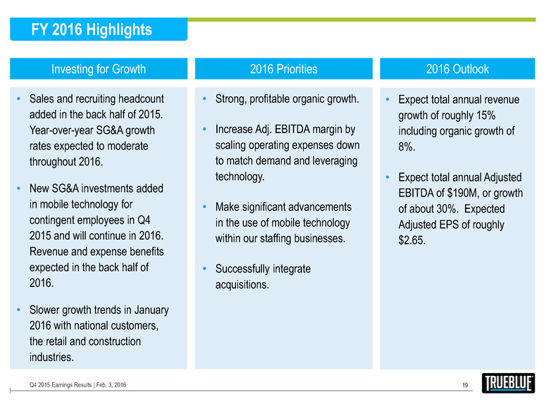 EBITDA and Adjusted EBITDA are non-GAAP financial measures. EBITDA excludes interest, taxes, depreciation and amortization from net income. Adjusted EBITDA further excludes from EBITDA non-recurring costs related to acquisition and integration costs, as well as, Work Opportunity Tax Credit third party processing fees. EBITDA and Adjusted EBITDA are key measures used by management to evaluate performance. EBITDA and Adjusted EBITDA should not be considered measures of financial performance in isolation or as an alternative to Income from operations in the Consolidated Statements of Operations in accordance with GAAP, and may not be comparable to similarly titled measures of other companies. Adjusted net income (loss) per diluted share is a non-GAAP financial measure which excludes from net income(loss) on a per diluted share basis non-recurring costs related to the purchase, integration, reorganization and shutdown activities related to acquisitions, net of tax, amortization of intangibles of acquired businesses, net of tax, as well as, Work Opportunity Tax Credit third party processing fees, net of tax, and adjusts income taxes to the expected ongoing effective rate. Adjusted net income(loss) per diluted share is a key measure used by management to evaluate performance and communicate comparable results. Adjusted net income(loss) per diluted share should not be considered a measure of financial performance in isolation or as an alternative to net income(loss) per diluted share in the Consolidated Statements of Operations in accordance with GAAP, and may not be comparable to similarly titled measures of other companies. See “Financials” in the Investors section of our web site at www.trueblue.com for a full reconciliation of non-GAAP financial measures to GAAP financial results. NON-GAAP TERMS AND DEFINITIONS 22 Q4 2015 Earnings Results | Feb. 3, 2016