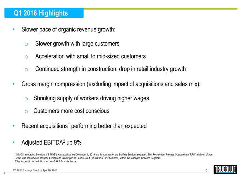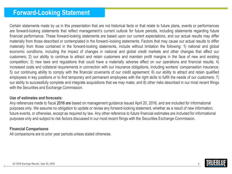 Forward-Looking Statement Certain statements made by us in this presentation that are not historical facts or that relate to future plans, events or performances are forward-looking statements that reflect management’s current outlook for future periods, including statements regarding future financial performance. These forward-looking statements are based upon our current expectations, and our actual results may differ materially from those described or contemplated in the forward–looking statements. Factors that may cause our actual results to differ materially from those contained in the forward-looking statements, include without limitation the following: 1) national and global economic conditions, including the impact of changes in national and global credit markets and other changes that affect our customers; 2) our ability to continue to attract and retain customers and maintain profit margins in the face of new and existing competition; 3) new laws and regulations that could have a materially adverse effect on our operations and financial results; 4) increased costs and collateral requirements in connection with our insurance obligations, including workers’ compensation insurance; 5) our continuing ability to comply with the financial covenants of our credit agreement; 6) our ability to attract and retain qualified employees in key positions or to find temporary and permanent employees with the right skills to fulfill the needs of our customers; 7) our ability to successfully complete and integrate acquisitions that we may make; and 8) other risks described in our most recent filings with the Securities and Exchange Commission. Use of estimates and forecasts: Any references made to fiscal 2016 are based on management guidance issued April 20, 2016, and are included for informational purposes only. We assume no obligation to update or revise any forward-looking statement, whether as a result of new information, future events, or otherwise, except as required by law. Any other reference to future financial estimates are included for informational purposes only and subject to risk factors discussed in our most recent filings with the Securities Exchange Commission. Financial Comparisons All comparisons are to prior year periods unless stated otherwise. Q1 2016 Earnings Results | April 20, 2016 2