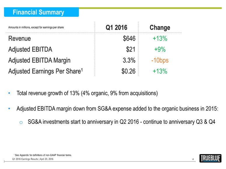 Q1 2016 Highlights • Slower pace of organic revenue growth: o Slower growth with large customers o Acceleration with small to mid-sized customers o Continued strength in construction; drop in retail industry growth • Gross margin compression (excluding impact of acquisitions and sales mix): o Shrinking supply of workers driving higher wages o Customers more cost conscious • Recent acquisitions1 performing better than expected • Adjusted EBITDA2 up 9% 3 Q1 2016 Earnings Results | April 20, 2016 1 SIMOS Insourcing Solutions (“SIMOS”) was acquired on December 1, 2015 and is now part of the Staffing Services segment. The Recruitment Process Outsourcing (“RPO”) division of Aon Hewitt was acquired on January 4, 2016 and is now part of PeopleScout (TrueBlue’s RPO business) within the Managed Services Segment. 2 See Appendix for definitions of non-GAAP financial terms.