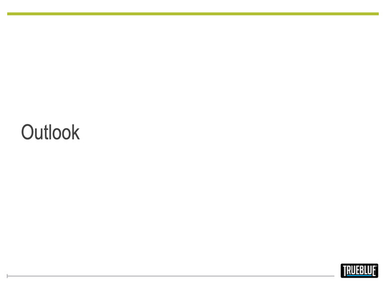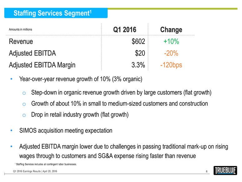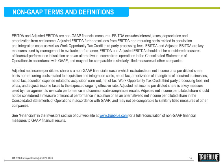 EBITDA and Adjusted EBITDA are non-GAAP financial measures. EBITDA excludes interest, taxes, depreciation and amortization from net income. Adjusted EBITDA further excludes from EBITDA non-recurring costs related to acquisition and integration costs as well as Work Opportunity Tax Credit third party processing fees. EBITDA and Adjusted EBITDA are key measures used by management to evaluate performance. EBITDA and Adjusted EBITDA should not be considered measures of financial performance in isolation or as an alternative to Income from operations in the Consolidated Statements of Operations in accordance with GAAP, and may not be comparable to similarly titled measures of other companies. Adjusted net income per diluted share is a non-GAAP financial measure which excludes from net income on a per diluted share basis non-recurring costs related to acquisition and integration costs, net of tax, amortization of intangibles of acquired businesses, net of tax, accretion expense related to acquisition earn-out, net of tax, Work Opportunity Tax Credit third-party processing fees, net of tax, and adjusts income taxes to the expected ongoing effective rate. Adjusted net income per diluted share is a key measure used by management to evaluate performance and communicate comparable results. Adjusted net income per diluted share should not be considered a measure of financial performance in isolation or as an alternative to net income per diluted share in the Consolidated Statements of Operations in accordance with GAAP, and may not be comparable to similarly titled measures of other companies. See “Financials” in the Investors section of our web site at www.trueblue.com for a full reconciliation of non-GAAP financial measures to GAAP financial results. NON-GAAP TERMS AND DEFINITIONS 14 Q1 2016 Earnings Results | April 20, 2016