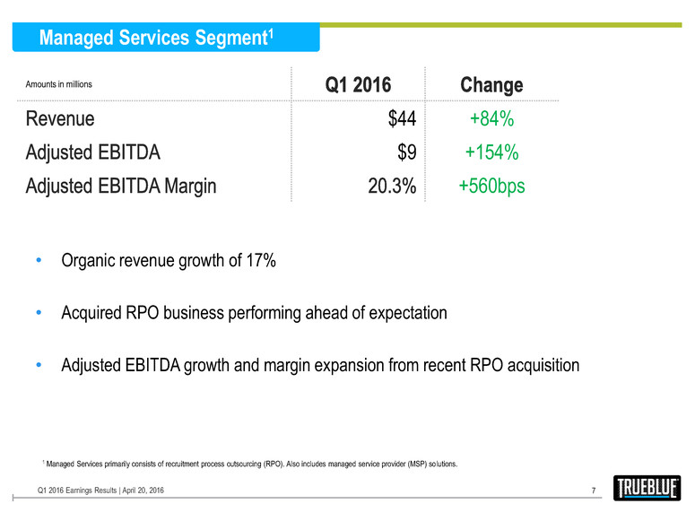 Staffing Services Segment1 6 Amounts in millions $602 +10% $20 -20% -120bps • Year-over-year revenue growth of 10% (3% organic) o Step-down in organic revenue growth driven by large customers (flat growth) o Growth of about 10% in small to medium-sized customers and construction o Drop in retail industry growth (flat growth) • SIMOS acquisition meeting expectation • Adjusted EBITDA margin lower due to challenges in passing traditional mark-up on rising wages through to customers and SG&A expense rising faster than revenue Q1 2016 Earnings Results | April 20, 2016 1 Staffing Services includes all contingent labor businesses.