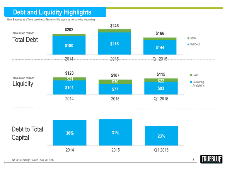 Managed Services Segment1 7 Amounts in millions $44 +84% $9 +154% +560bps • Organic revenue growth of 17% • Acquired RPO business performing ahead of expectation • Adjusted EBITDA growth and margin expansion from recent RPO acquisition Q1 2016 Earnings Results | April 20, 2016 1 Managed Services primarily consists of recruitment process outsourcing (RPO). Also includes managed service provider (MSP) solutions.