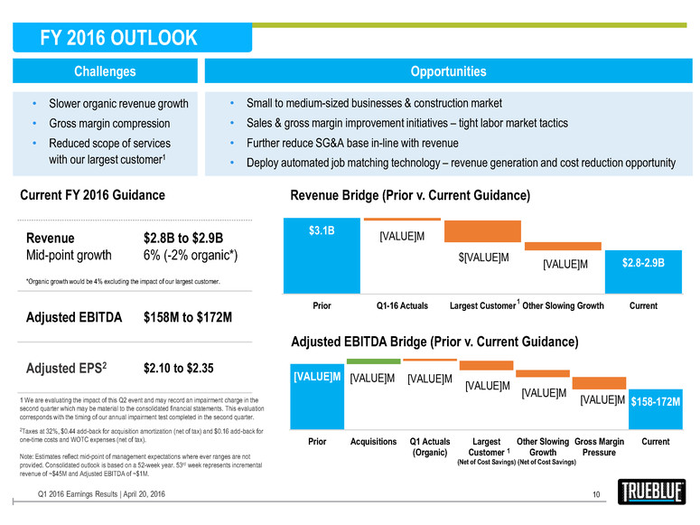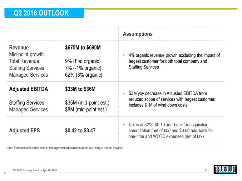 1 We are evaluating the impact of this Q2 event and may record an impairment charge in the second quarter which may be material to the consolidated financial statements. This evaluation corresponds with the timing of our annual impairment test completed in the second quarter. 2Taxes at 32%, $0.44 add-back for acquisition amortization (net of tax) and $0.16 add-back for one-time costs and WOTC expenses (net of tax). Note: Estimates reflect mid-point of management expectations where ever ranges are not provided. Consolidated outlook is based on a 52-week year. 53rd week represents incremental revenue of ~$45M and Adjusted EBITDA of ~$1M. • Small to medium-sized businesses & construction market • Sales & gross margin improvement initiatives – tight labor market tactics • Further reduce SG&A base in-line with revenue • Deploy automated job matching technology – revenue generation and cost reduction opportunity $3.1B $2.8-2.9B [VALUE]M $[VALUE]M [VALUE]M Prior Q1-16 Actuals Largest Customer Other Slowing Growth Current [VALUE]M $158-172M [VALUE]M [VALUE]M [VALUE]M [VALUE]M [VALUE]M Prior Acquisitions Q1 Actuals (Organic) Largest Customer Other Slowing Growth Gross Margin Pressure Current Revenue Mid-point growth $2.8B to $2.9B 6% (-2% organic*) *Organic growth would be 4% excluding the impact of our largest customer. Adjusted EBITDA $158M to $172M Adjusted EPS2 $2.10 to $2.35 FY 2016 OUTLOOK 10 Challenges Opportunities • Slower organic revenue growth • Gross margin compression • Reduced scope of services with our largest customer1 Current FY 2016 Guidance Revenue Bridge (Prior v. Current Guidance) Adjusted EBITDA Bridge (Prior v. Current Guidance) 1 1 (Net of Cost Savings) (Net of Cost Savings) Q1 2016 Earnings Results | April 20, 2016