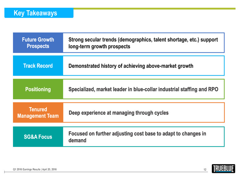 Assumptions Revenue Mid-point growth Total Revenue Staffing Services Managed Services $675M to $690M 9% (Flat organic) 7% (-1% organic) 62% (3% organic) • 4% organic revenue growth excluding the impact of largest customer for both total company and Staffing Services Adjusted EBITDA Staffing Services Managed Services $33M to $36M $35M (mid-point est.) $8M (mid-point est.) • $3M yoy decrease in Adjusted EBITDA from reduced scope of services with largest customer, includes $1M of wind down costs Adjusted EPS $0.42 to $0.47 • Taxes at 32%, $0.10 add-back for acquisition amortization (net of tax) and $0.06 add-back for one-time and WOTC expenses (net of tax) Q2 2016 OUTLOOK 11 Q1 2016 Earnings Results | April 20, 2016 Note: Estimates reflect mid-point of management expectations where ever ranges are not provided.