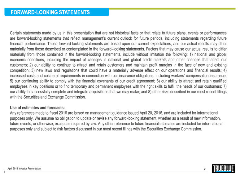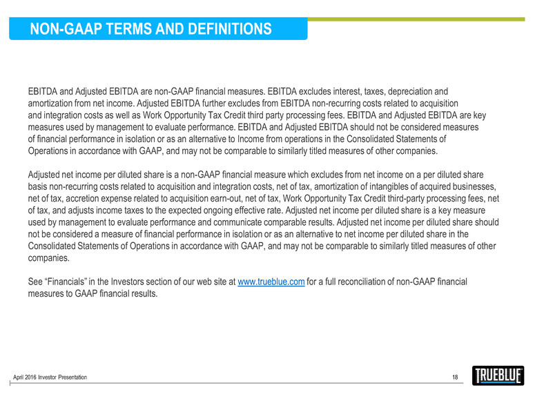 EBITDA and Adjusted EBITDA are non-GAAP financial measures. EBITDA excludes interest, taxes, depreciation and amortization from net income. Adjusted EBITDA further excludes from EBITDA non-recurring costs related to acquisition and integration costs as well as Work Opportunity Tax Credit third party processing fees. EBITDA and Adjusted EBITDA are key measures used by management to evaluate performance. EBITDA and Adjusted EBITDA should not be considered measures of financial performance in isolation or as an alternative to Income from operations in the Consolidated Statements of Operations in accordance with GAAP, and may not be comparable to similarly titled measures of other companies. Adjusted net income per diluted share is a non-GAAP financial measure which excludes from net income on a per diluted share basis non-recurring costs related to acquisition and integration costs, net of tax, amortization of intangibles of acquired businesses, net of tax, accretion expense related to acquisition earn-out, net of tax, Work Opportunity Tax Credit third-party processing fees, net of tax, and adjusts income taxes to the expected ongoing effective rate. Adjusted net income per diluted share is a key measure used by management to evaluate performance and communicate comparable results. Adjusted net income per diluted share should not be considered a measure of financial performance in isolation or as an alternative to net income per diluted share in the Consolidated Statements of Operations in accordance with GAAP, and may not be comparable to similarly titled measures of other companies. See “Financials” in the Investors section of our web site at www.trueblue.com for a full reconciliation of non-GAAP financial measures to GAAP financial results. NON-GAAP TERMS AND DEFINITIONS 18 April 2016 Investor Presentation