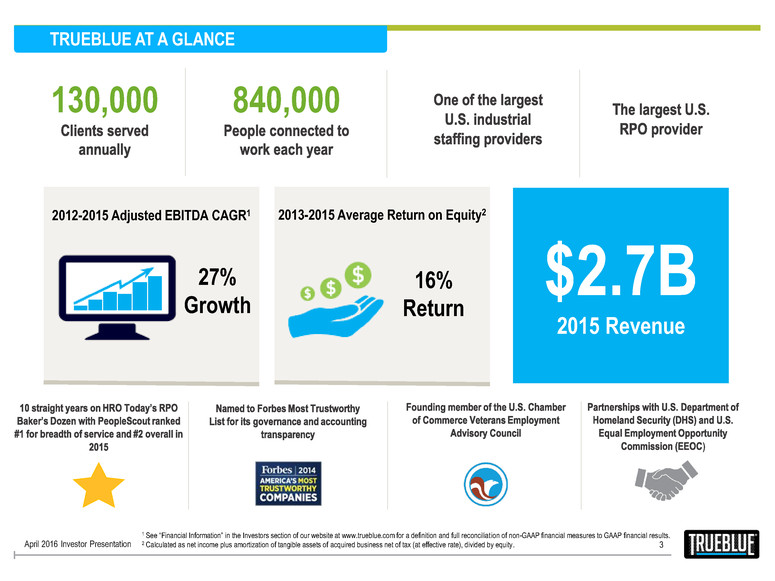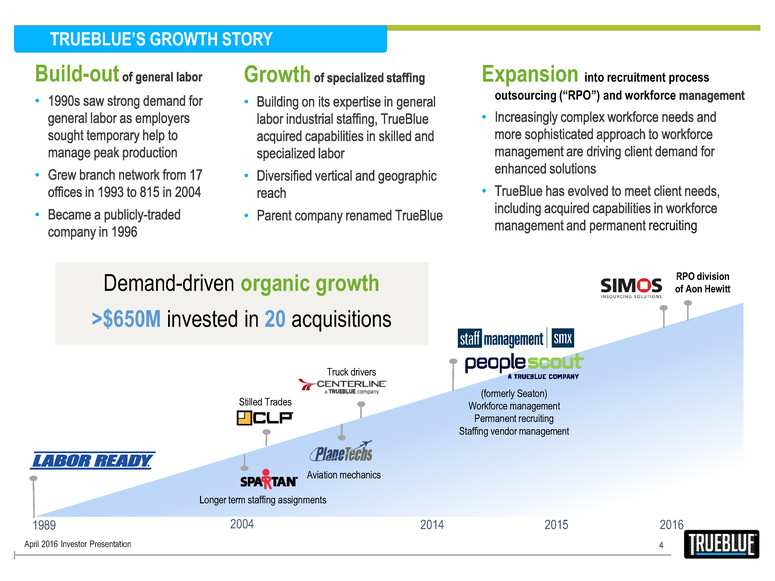 ) 3 130,000 840,000 April 2016 Investor Presentation TRUEBLUE AT A GLANCE $2.7B 2015 Revenue 2013-2015 Average Return on Equity2 27% Growth 2012-2015 Adjusted EBITDA CAGR1 16% Return 1 See “Financial Information” in the Investors section of our website at www.trueblue.com for a definition and full reconciliat ion of non-GAAP financial measures to GAAP financial results. 2 Calculated as net income plus amortization of tangible assets of acquired business net of tax (at effective rate), divided by equity.