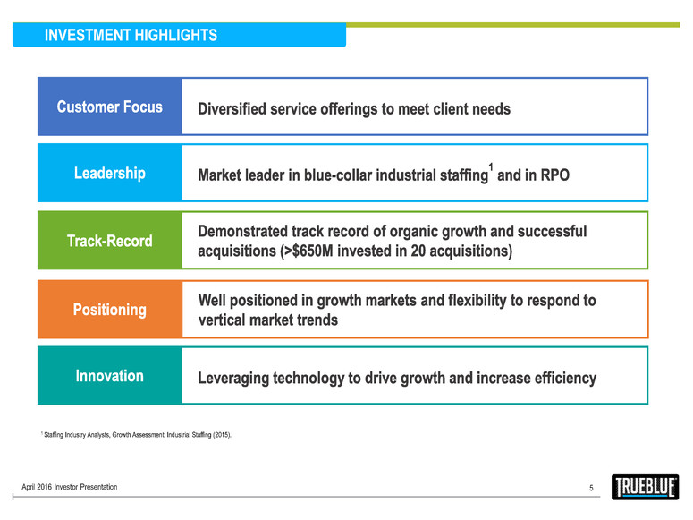 Demand-driven organic growth >$650M invested in 20 acquisitions 4 1989 Build-out • • • 2004 Growth • • • Expansion into recruitment process outsourcing (“RPO”) and workforce • • recruiting 2014 Longer term staffing assignments Stilled Trades Aviation mechanics Truck drivers (formerly Seaton) Workforce management Permanent recruiting Staffing vendor management 2015 TRUEBLUE’S GROWTH STORY RPO division of Aon Hewitt 2016 April 2016 Investor Presentation