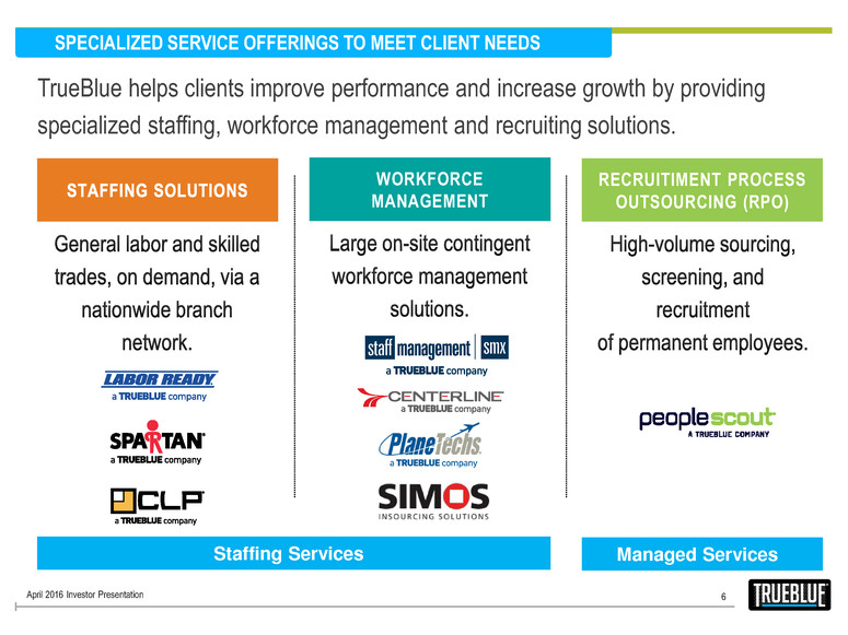 1 Staffing Industry Analysts, Growth Assessment: Industrial Staffing (2015). April 2016 Investor Presentation 5 INVESTMENT HIGHLIGHTS