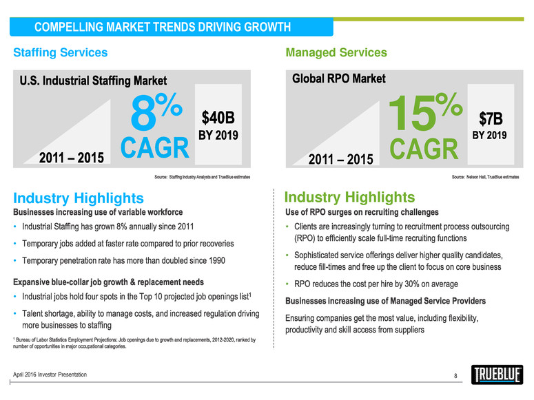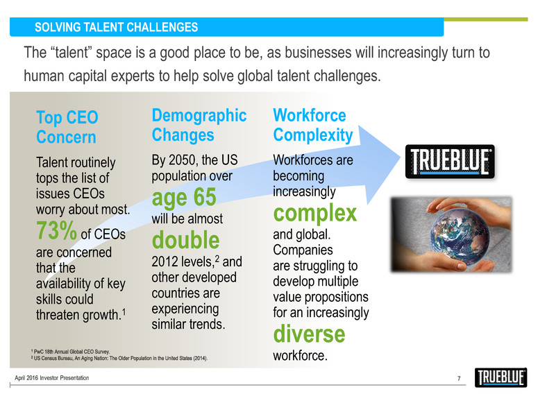 6 WORKFORCE MANAGEMENT RECRUITIMENT PROCESS OUTSOURCING (RPO) TrueBlue helps clients improve performance and increase growth by providing specialized staffing, workforce management and recruiting solutions. April 2016 Investor Presentation SPECIALIZED SERVICE OFFERINGS TO MEET CLIENT NEEDS Staffing Services Managed Services