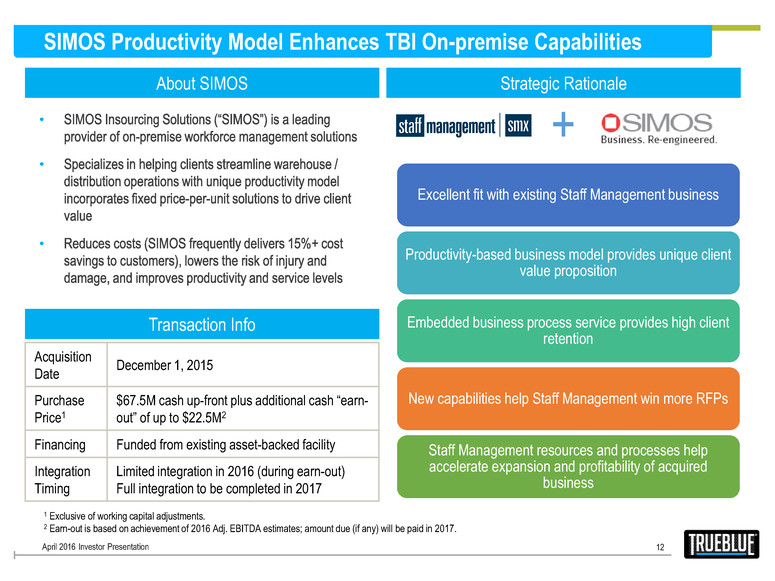 SIMOS Productivity Model Enhances TBI On-premise Capabilities 12 April 2016 Investor Presentation • • • About SIMOS Transaction Info Acquisition Date December 1, 2015 Purchase Price1 $67.5M cash up-front plus additional cash “earn- out” of up to $22.5M2 Financing Funded from existing asset-backed facility Integration Timing Limited integration in 2016 (during earn-out) Full integration to be completed in 2017 1 Exclusive of working capital adjustments. 2 Earn-out is based on achievement of 2016 Adj. EBITDA estimates; amount due (if any) will be paid in 2017. + Excellent fit with existing Staff Management business Productivity-based business model provides unique client value proposition Embedded business process service provides high client retention New capabilities help Staff Management win more RFPs Staff Management resources and processes help accelerate expansion and profitability of acquired business Strategic Rationale