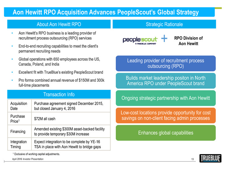 Aon Hewitt RPO Acquisition Advances PeopleScout’s Global Strategy 13 April 2016 Investor Presentation • • • • • About Aon Hewitt RPO Transaction Info 1 Exclusive of working capital adjustments. + Leading provider of recruitment process outsourcing (RPO) Builds market leadership positon in North America RPO under PeopleScout brand Ongoing strategic partnership with Aon Hewitt Low-cost locations provide opportunity for cost savings on non-client facing admin processes Enhances global capabilities Strategic Rationale Acquisition Date Purchase agreement signed December 2015, but closed January 4, 2016 Purchase Price1 $72M all cash Financing Amended existing $300M asset-backed facility to provide temporary $30M increase Integration Timing Expect integration to be complete by YE-16 TSA in place with Aon Hewitt to bridge gaps RPO Division of Aon Hewitt