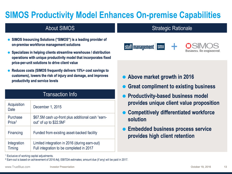 2 Earn-out is based on achievement of 2016 Adj. EBITDA estimates; amount due (if any) will be paid in 2017.