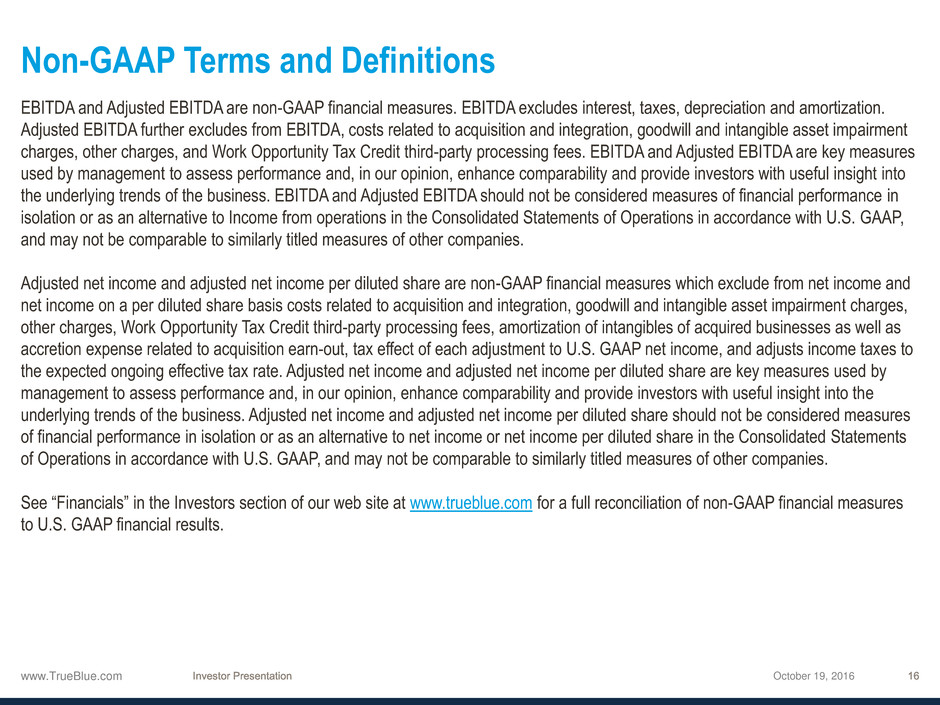 See “Financials” in the Investors section of our web site at www.trueblue.com for a full reconciliation of non-GAAP financial measures