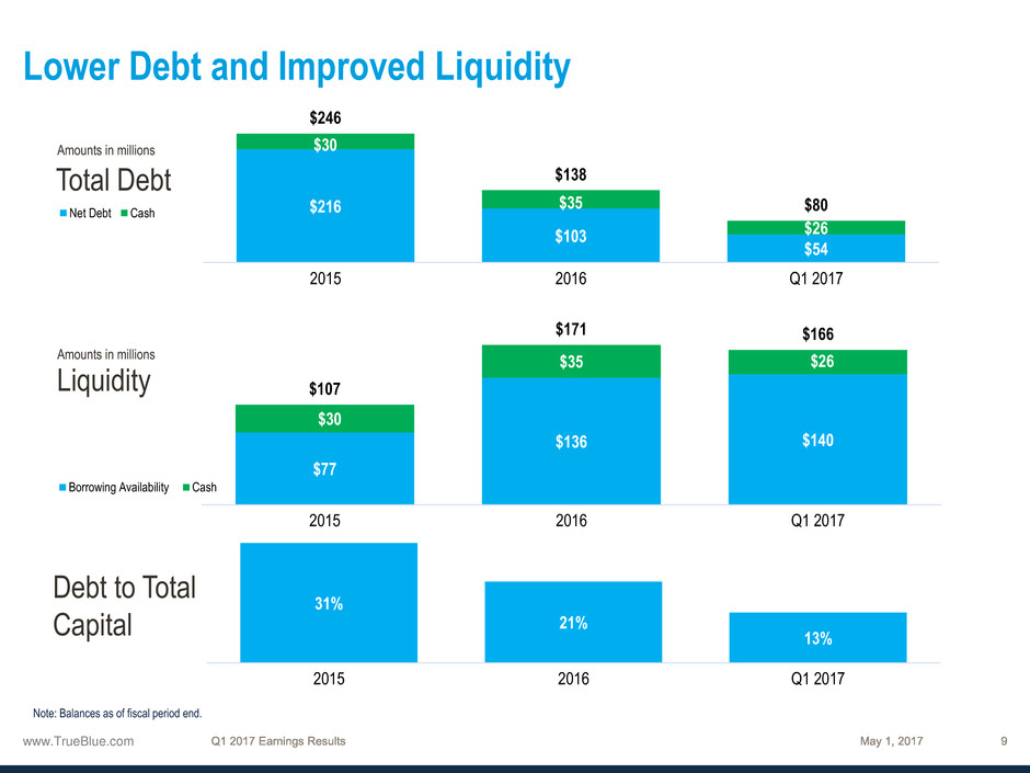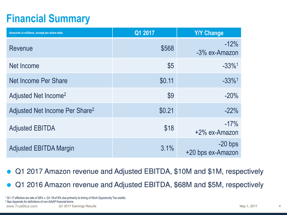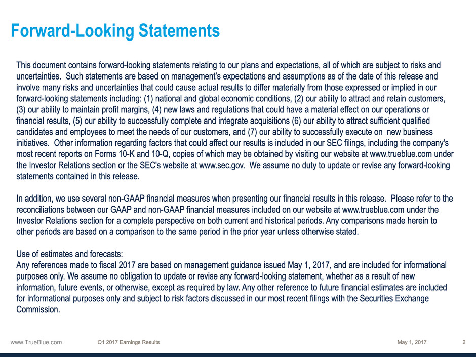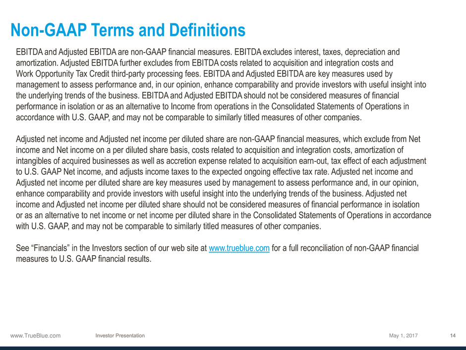 See “Financials” in the Investors section of our web site at www.trueblue.com for a full reconciliation of non-GAAP financial