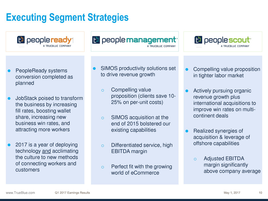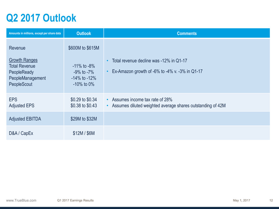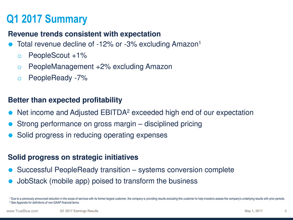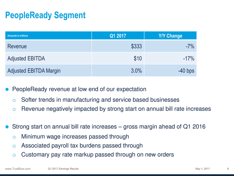 1 Q1-17 effective tax rate of 28% v. Q1-16 of 8% due primarily to timing of Work Opportunity Tax credits.