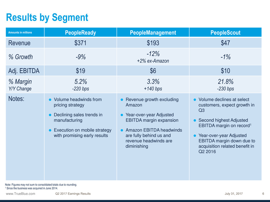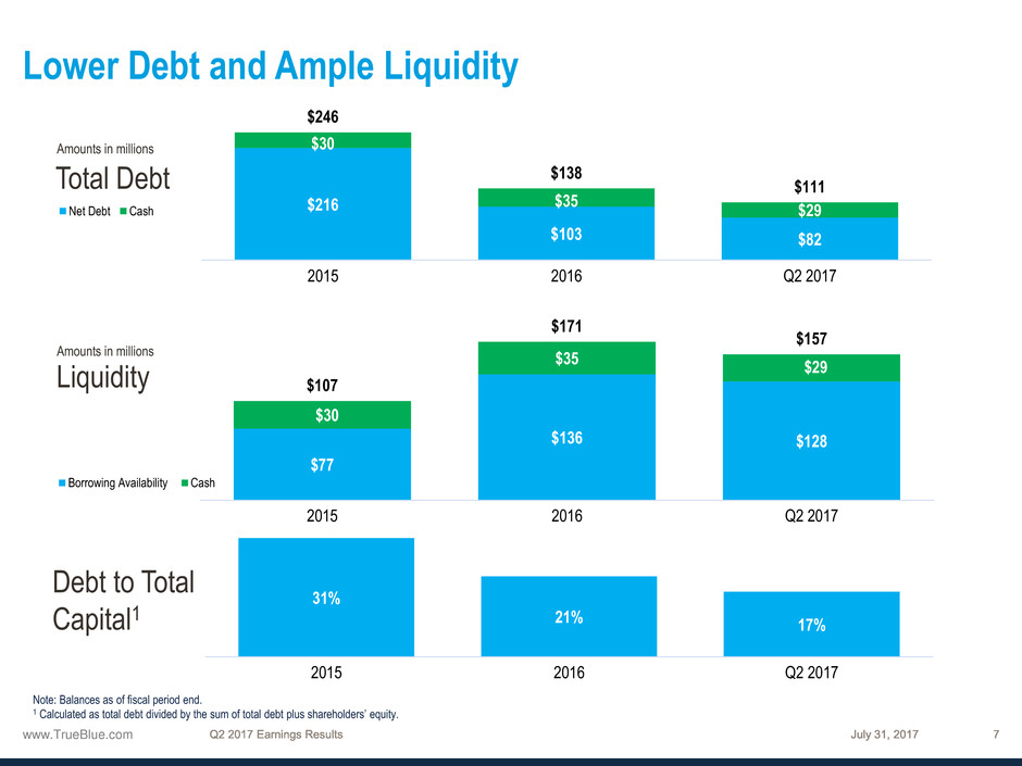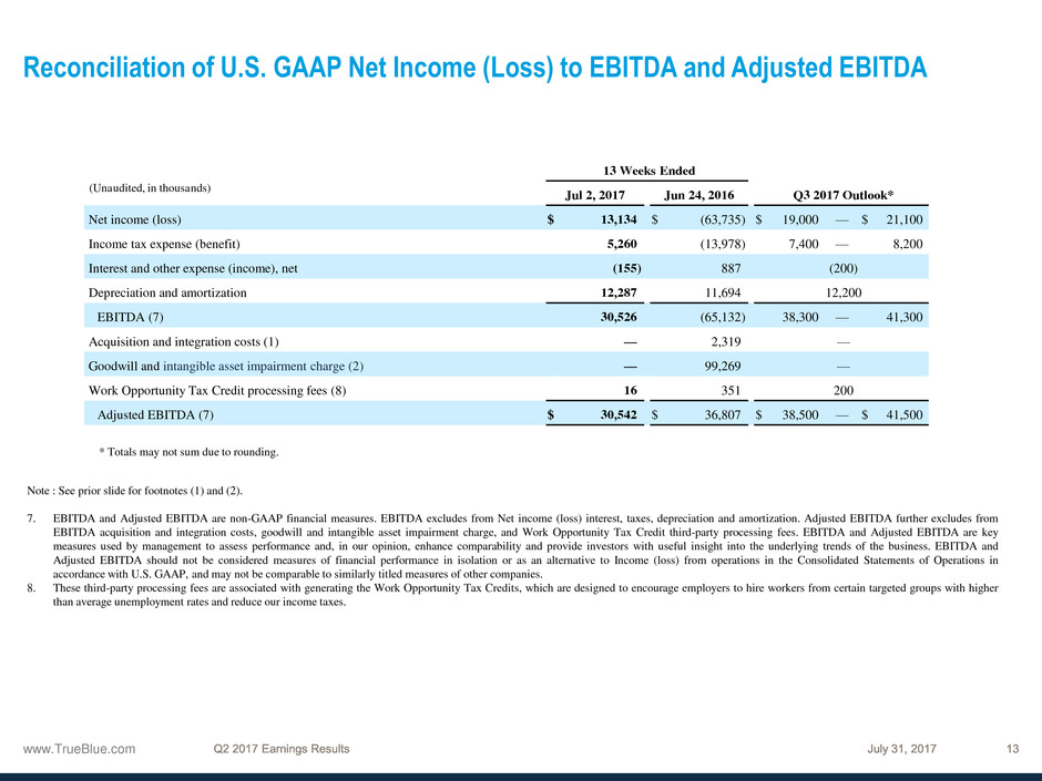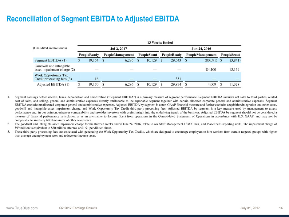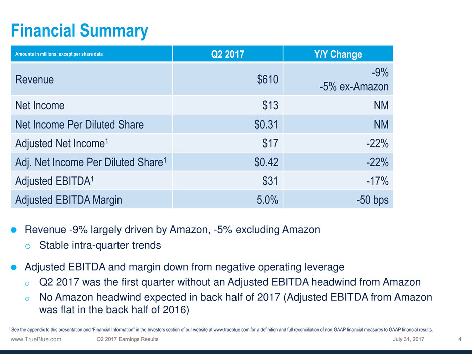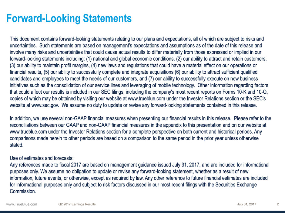 1 See the appendix to this presentation and “Financial Information” in the Investors section of our website at www.trueblue.com for a definition and full reconciliation of non-GAAP financial measures to GAAP financial results.