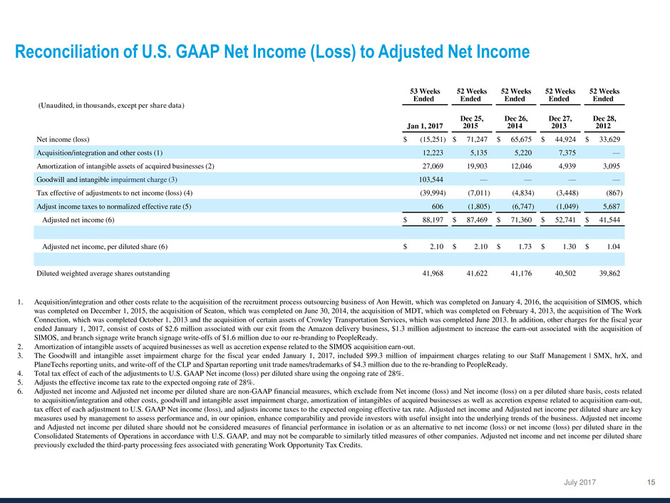 2. Acquisition/integration and other costs relate to the acquisition of the recruitment process outsourcing business of Aon Hewitt, which was completed on January 4, 2016, the acquisition of SIMOS, which