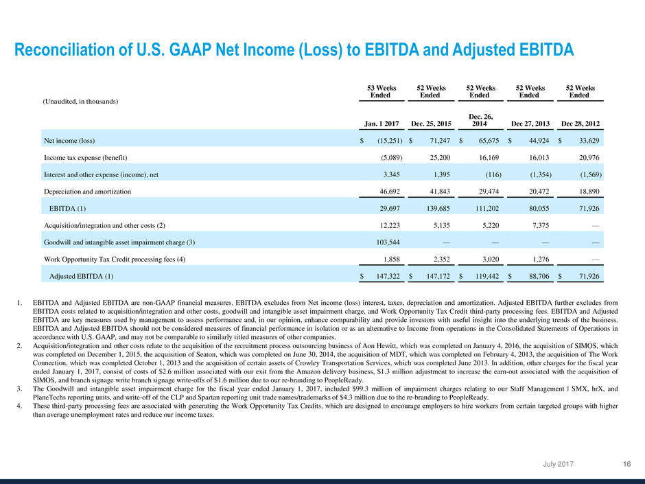 EBITDA costs related to acquisition/integration and other costs, goodwill and intangible asset impairment charge, and Work Opportunity Tax Credit third-party processing fees. EBITDA and Adjusted