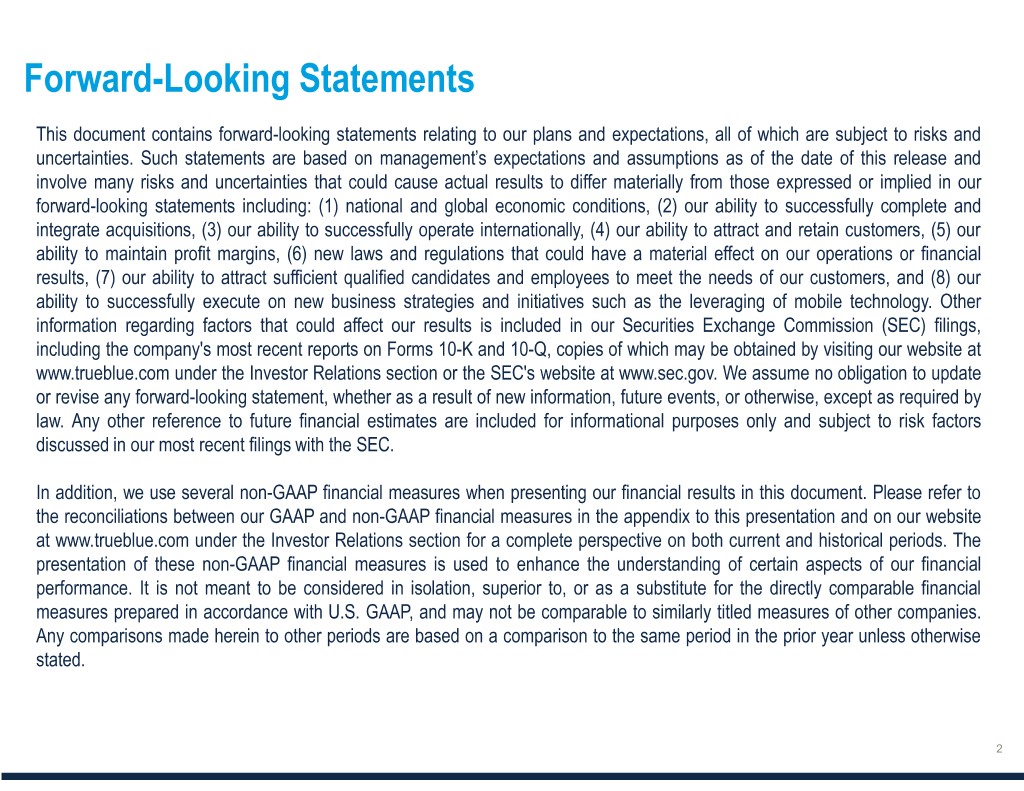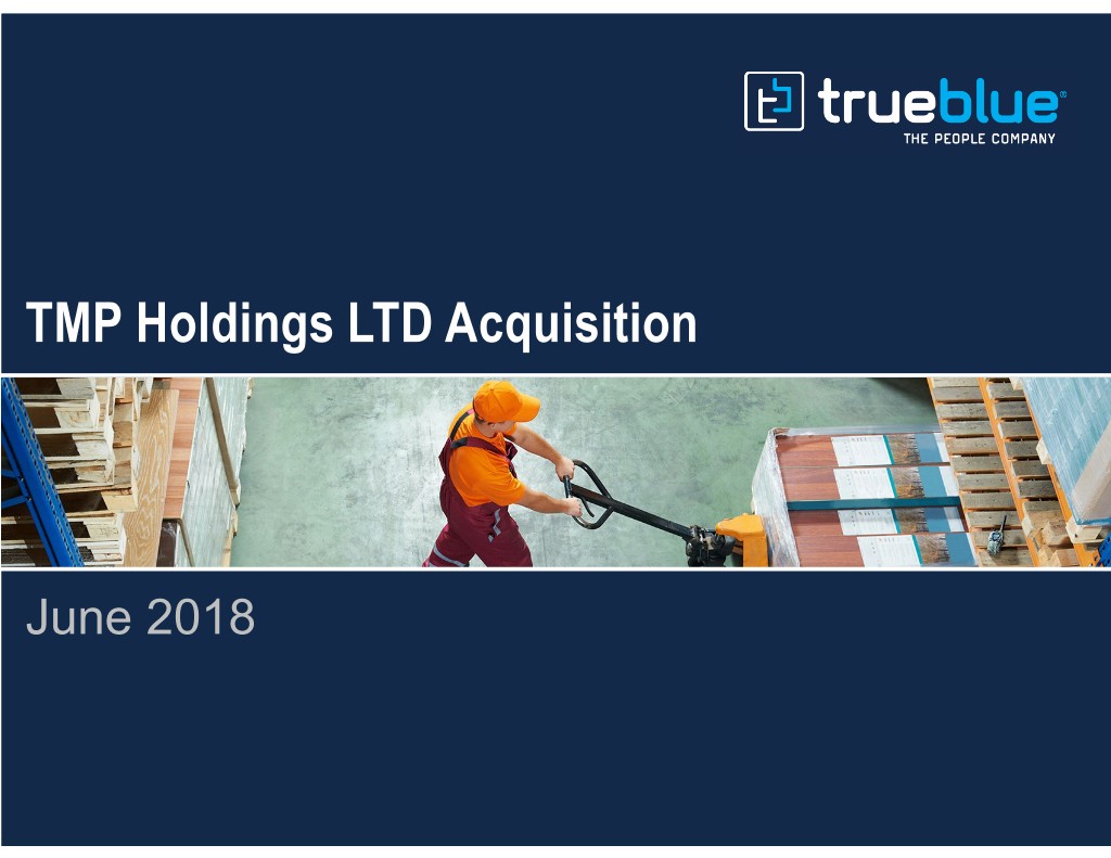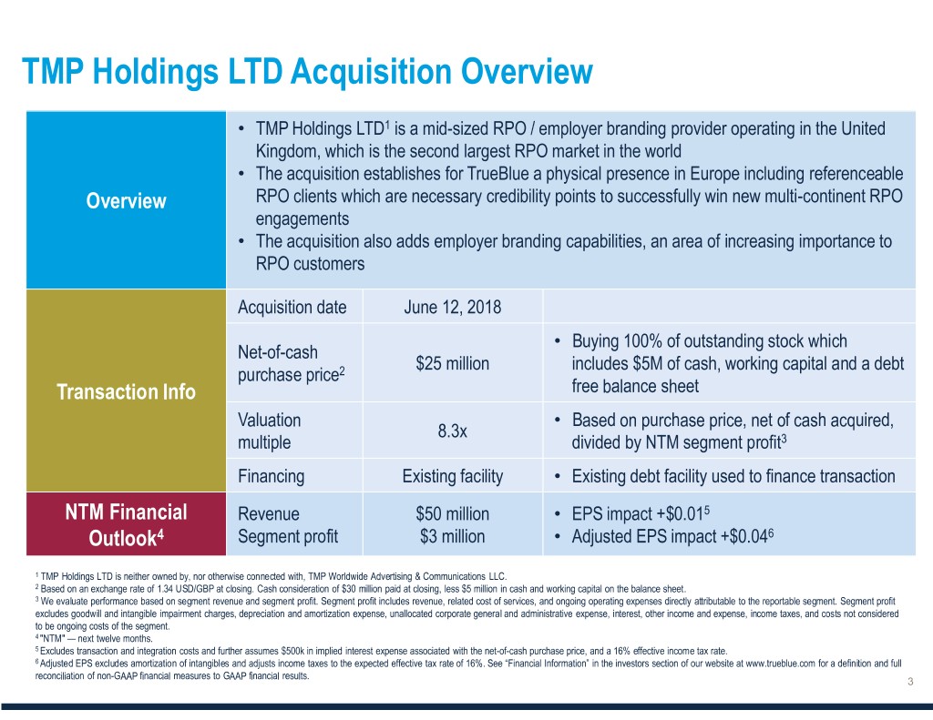 TMP Holdings LTD Acquisition Overview • TMP Holdings LTD1 is a mid-sized RPO / employer branding provider operating in the United Kingdom, which is the second largest RPO market in the world • The acquisition establishes for TrueBlue a physical presence in Europe including referenceable Overview RPO clients which are necessary credibility points to successfully win new multi-continent RPO engagements • The acquisition also adds employer branding capabilities, an area of increasing importance to RPO customers Acquisition date June 12, 2018 • Buying 100% of outstanding stock which Net-of-cash $25 million includes $5M of cash, working capital and a debt purchase price2 Transaction Info free balance sheet Valuation • Based on purchase price, net of cash acquired, 8.3x multiple divided by NTM segment profit3 Financing Existing facility • Existing debt facility used to finance transaction NTM Financial Revenue $50 million • EPS impact +$0.015 Outlook4 Segment profit $3 million • Adjusted EPS impact +$0.046 1 TMP Holdings LTD is neither owned by, nor otherwise connected with, TMP Worldwide Advertising & Communications LLC. 2 Based on an exchange rate of 1.34 USD/GBP at closing. Cash consideration of $30 million paid at closing, less $5 million in cash and working capital on the balance sheet. 3 We evaluate performance based on segment revenue and segment profit. Segment profit includes revenue, related cost of services, and ongoing operating expenses directly attributable to the reportable segment. Segment profit excludes goodwill and intangible impairment charges, depreciation and amortization expense, unallocated corporate general and administrative expense, interest, other income and expense, income taxes, and costs not considered to be ongoing costs of the segment. 4 "NTM" — next twelve months. 5 Excludes transaction and integration costs and further assumes $500k in implied interest expense associated with the net-of-cash purchase price, and a 16% effective income tax rate. 6 Adjusted EPS excludes amortization of intangibles and adjusts income taxes to the expected effective tax rate of 16%. See “Financial Information” in the investors section of our website at www.trueblue.com for a definition and full reconciliation of non-GAAP financial measures to GAAP financial results.