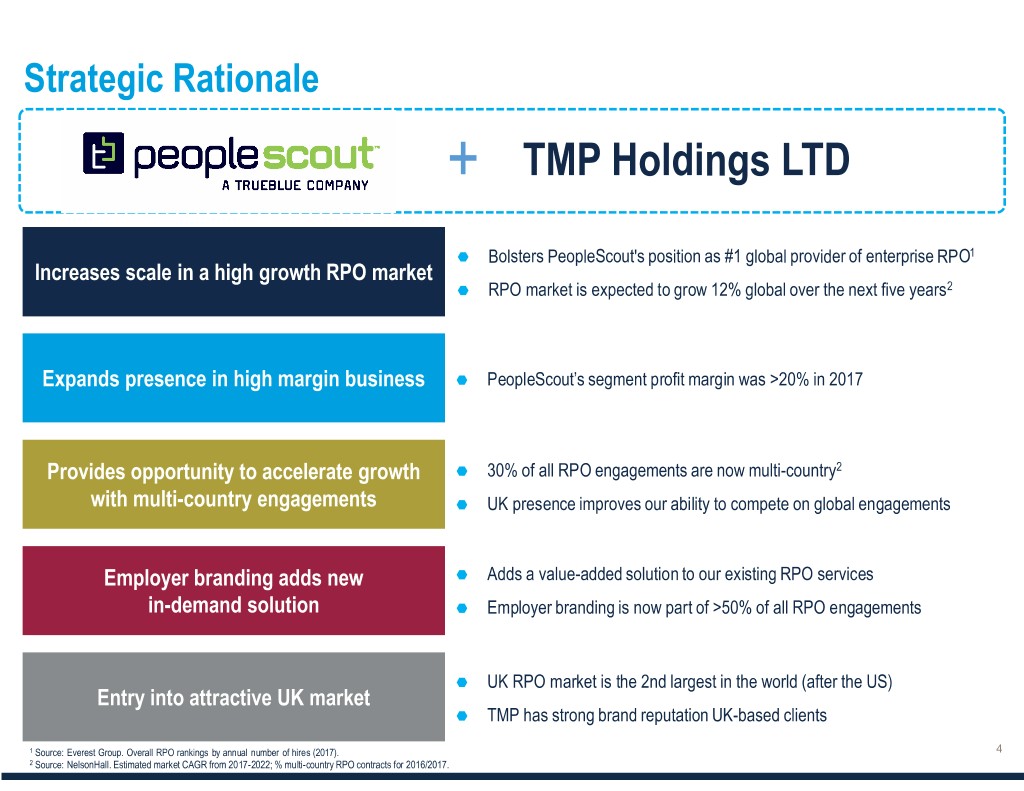 Strategic Rationale + TMP Holdings LTD Bolsters PeopleScout's position as #1 global provider of enterprise RPO1 RPO market is expected to grow 12% global over the next five years2 PeopleScout’s segment profit margin was >20% in 2017 30% of all RPO engagements are now multi-country2 UK presence improves our ability to compete on global engagements Adds a value-added solution to our existing RPO services Employer branding is now part of >50% of all RPO engagements UK RPO market is the 2nd largest in the world (after the US) TMP has strong brand reputation UK-based clients 1 Source: Everest Group. Overall RPO rankings by annual number of hires (2017). 2 Source: NelsonHall. Estimated market CAGR from 2017-2022; % multi-country RPO contracts for 2016/2017.