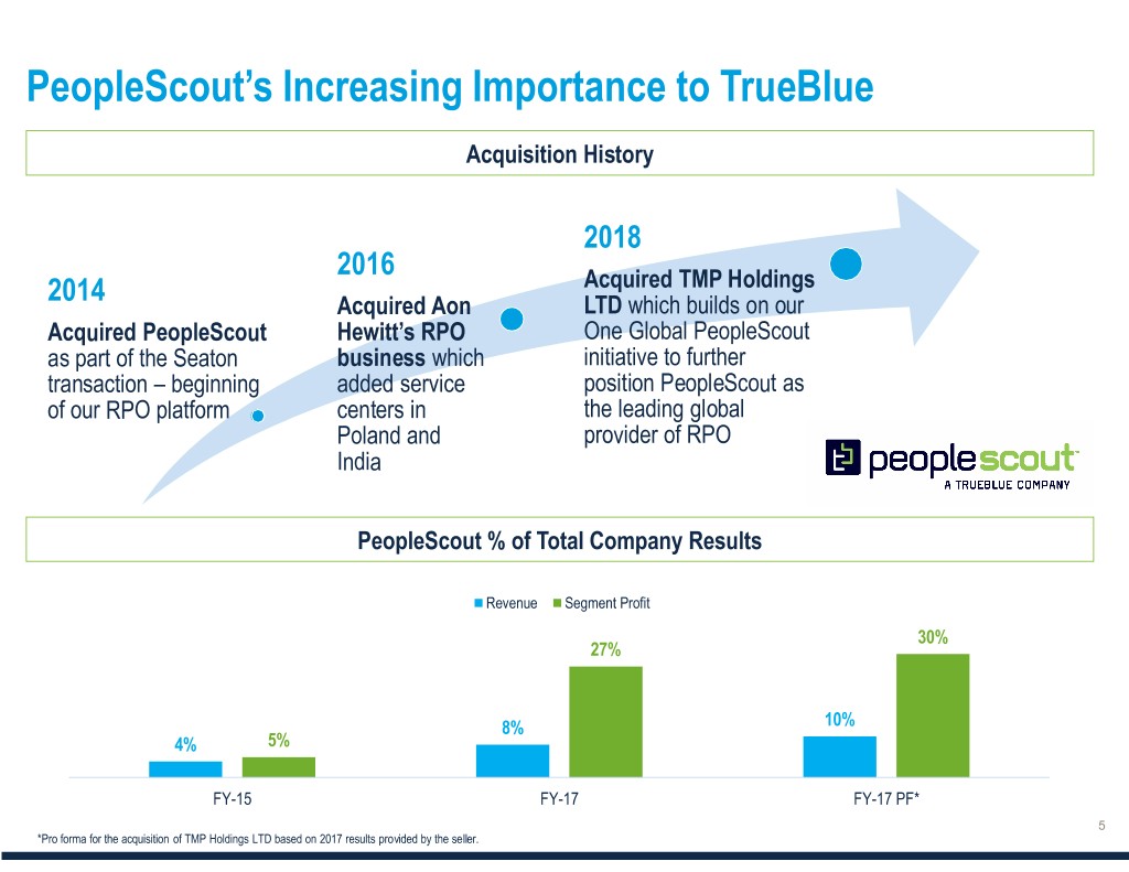 PeopleScout’s Increasing Importance to TrueBlue Acquisition History 2018 2016 Acquired TMP Holdings 2014 Acquired Aon LTD which builds on our Acquired PeopleScout Hewitt’s RPO One Global PeopleScout as part of the Seaton business which initiative to further transaction – beginning added service position PeopleScout as of our RPO platform centers in the leading global Poland and provider of RPO India PeopleScout % of Total Company Results Revenue Segment Profit 30% 27% 8% 10% 4% 5% FY-15 FY-17 FY-17 PF* *Pro forma for the acquisition of TMP Holdings LTD based on 2017 results provided by the seller.