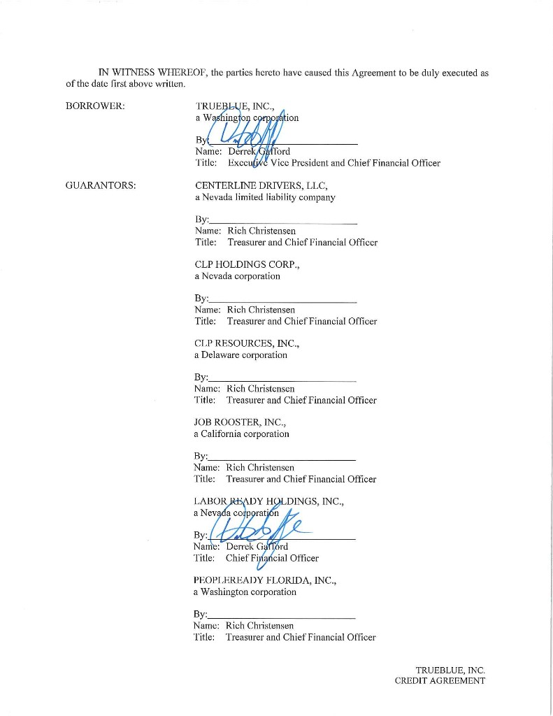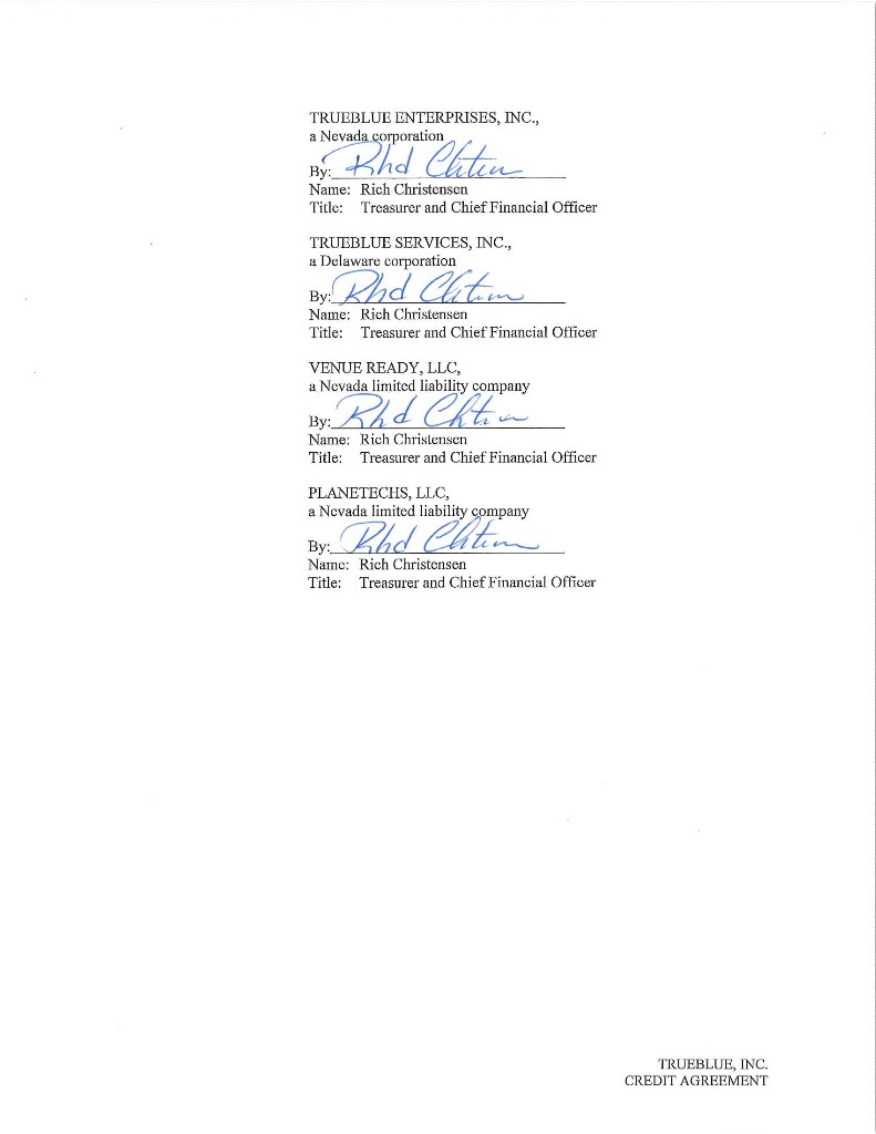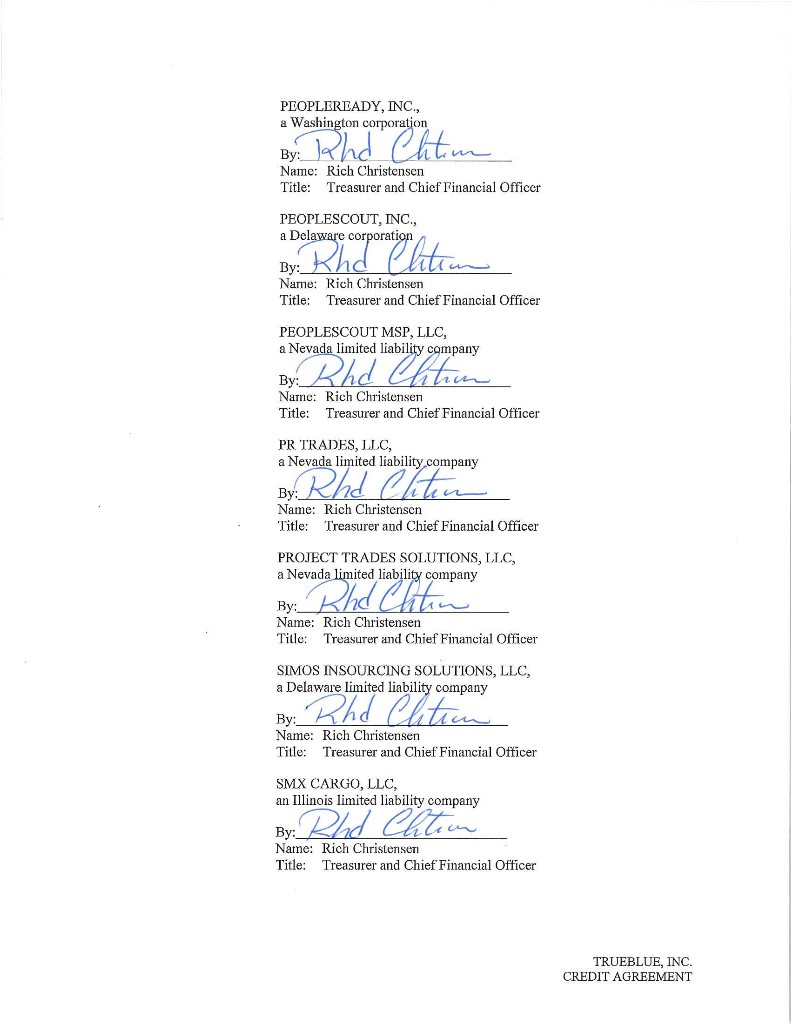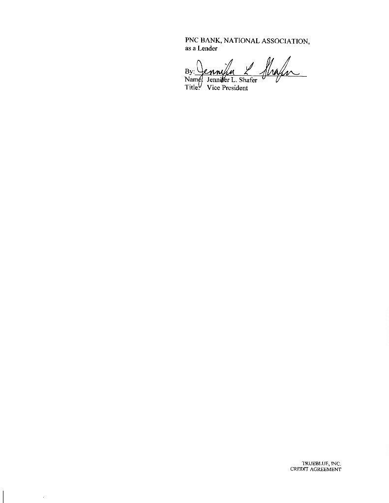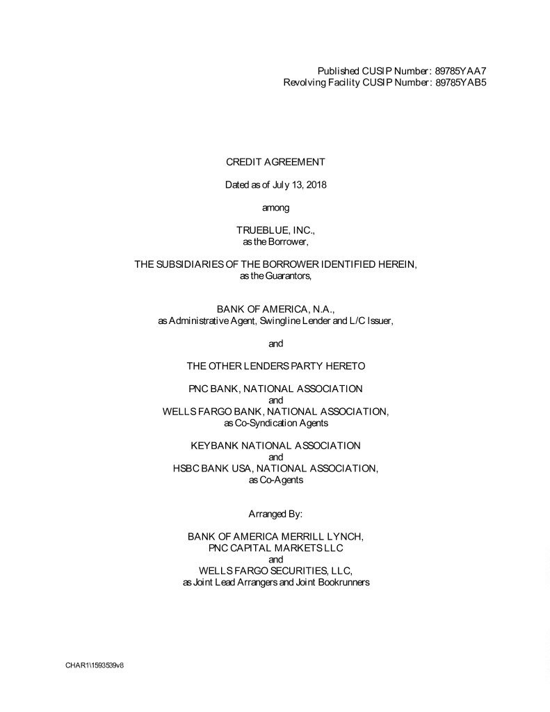 Published CUSIP Number: 89785YAA7 Revolving Facility CUSIP Number: 89785YAB5 CREDIT AGREEMENT Dated as of July 13, 2018 among TRUEBLUE, INC., as the Borrower, THE SUBSIDIARIES OF THE BORROWER IDENTIFIED HEREIN, as the Guarantors, BANK OF AMERICA, N.A., as Administrative Agent, Swingline Lender and L/C Issuer, and THE OTHER LENDERS PARTY HERETO PNC BANK, NATIONAL ASSOCIATION and WELLS FARGO BANK, NATIONAL ASSOCIATION, as Co-Syndication Agents KEYBANK NATIONAL ASSOCIATION and HSBC BANK USA, NATIONAL ASSOCIATION, as Co-Agents Arranged By: BANK OF AMERICA MERRILL LYNCH, PNC CAPITAL MARKETS LLC and WELLS FARGO SECURITIES, LLC, as Joint Lead Arrangers and Joint Bookrunners CHAR1\1593539v8