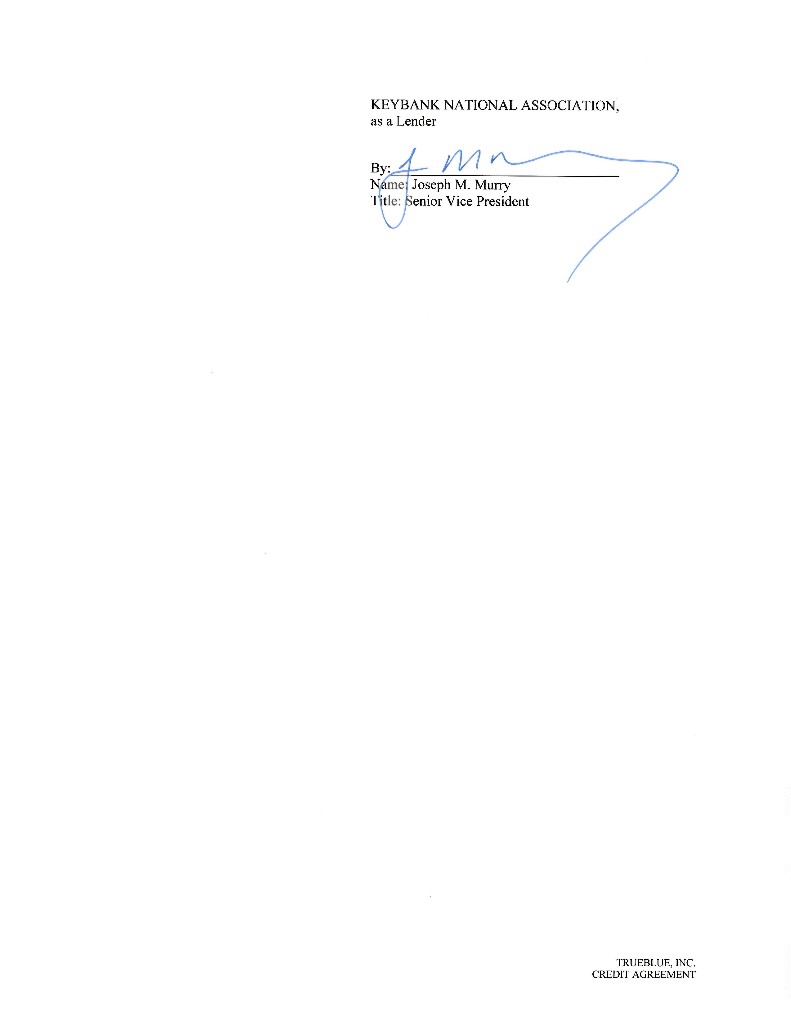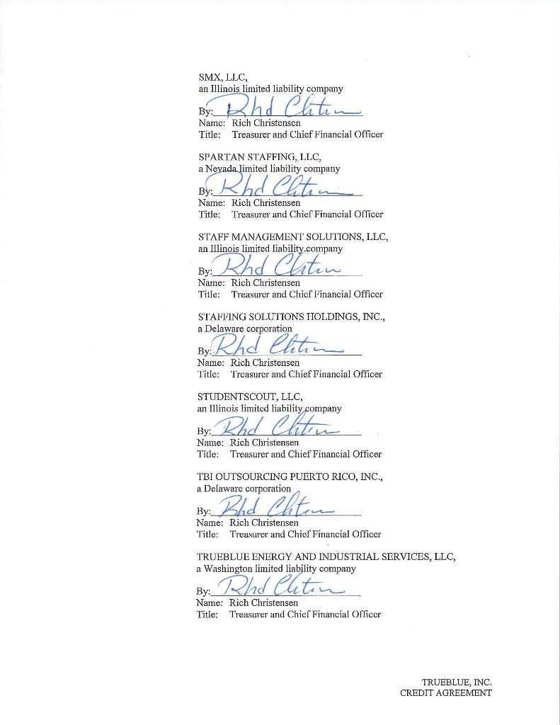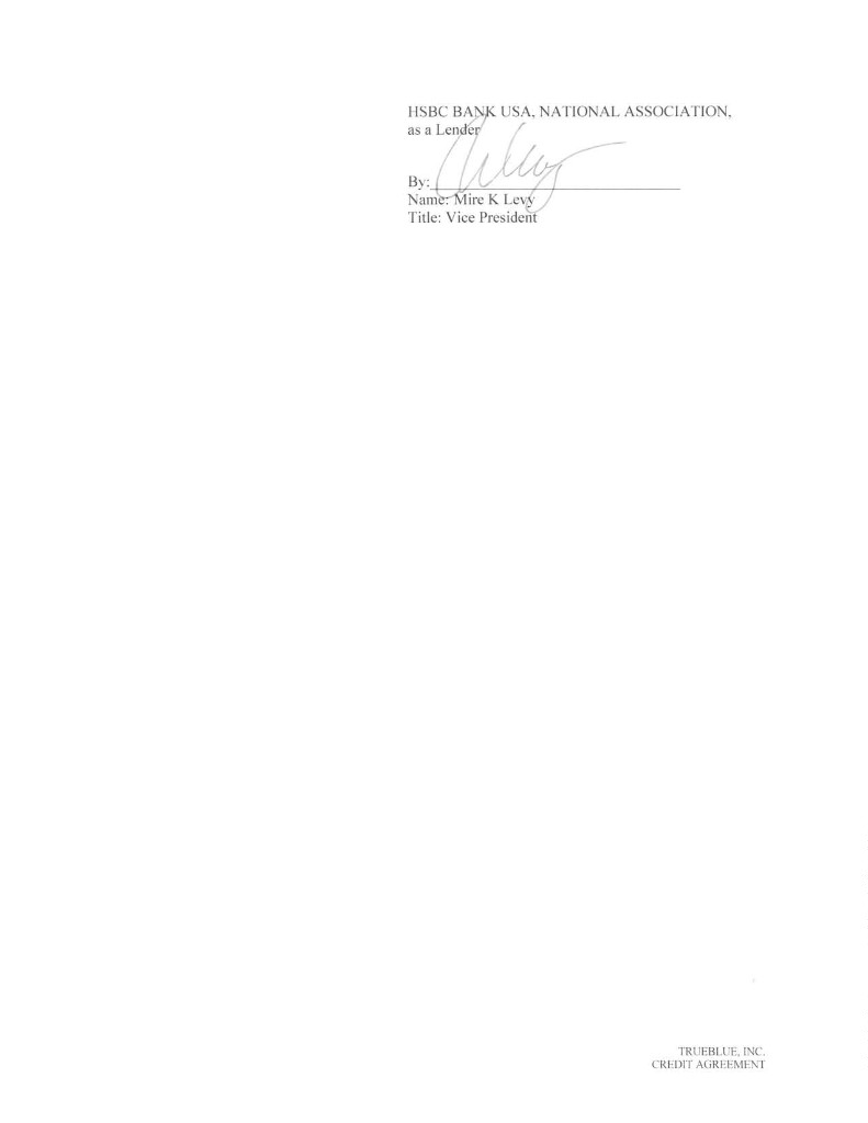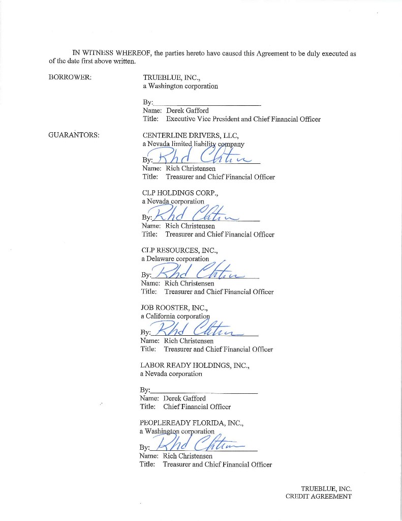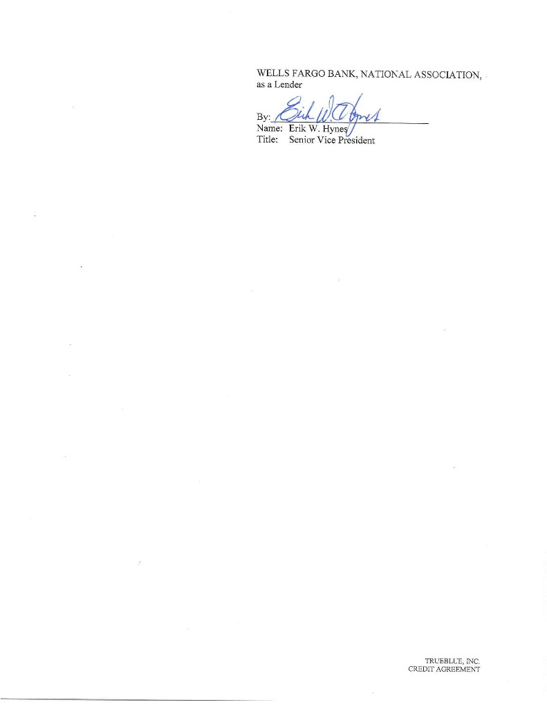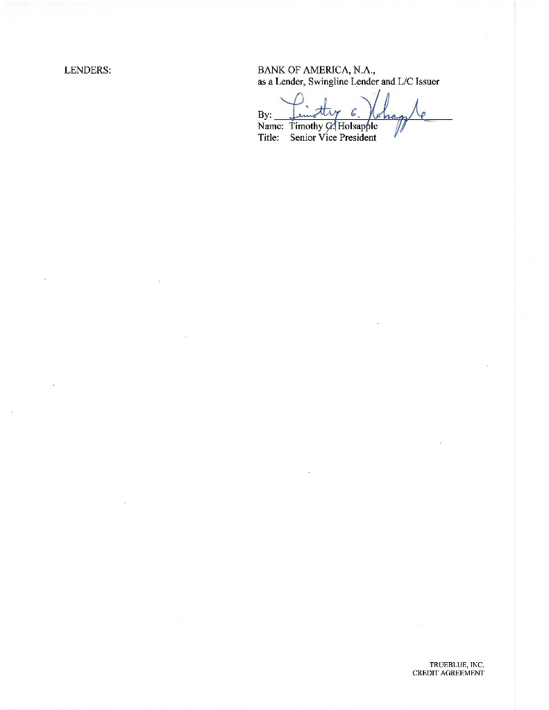 Published CUSIP Number: 89785YAA7 Revolving Facility CUSIP Number: 89785YAB5 CREDIT AGREEMENT Dated as of July 13, 2018 among TRUEBLUE, INC., as the Borrower, THE SUBSIDIARIES OF THE BORROWER IDENTIFIED HEREIN, as the Guarantors, BANK OF AMERICA, N.A., as Administrative Agent, Swingline Lender and L/C Issuer, and THE OTHER LENDERS PARTY HERETO PNC BANK, NATIONAL ASSOCIATION and WELLS FARGO BANK, NATIONAL ASSOCIATION, as Co-Syndication Agents KEYBANK NATIONAL ASSOCIATION and HSBC BANK USA, NATIONAL ASSOCIATION, as Co-Agents Arranged By: BANK OF AMERICA MERRILL LYNCH, PNC CAPITAL MARKETS LLC and WELLS FARGO SECURITIES, LLC, as Joint Lead Arrangers and Joint Bookrunners CHAR1\1593539v8