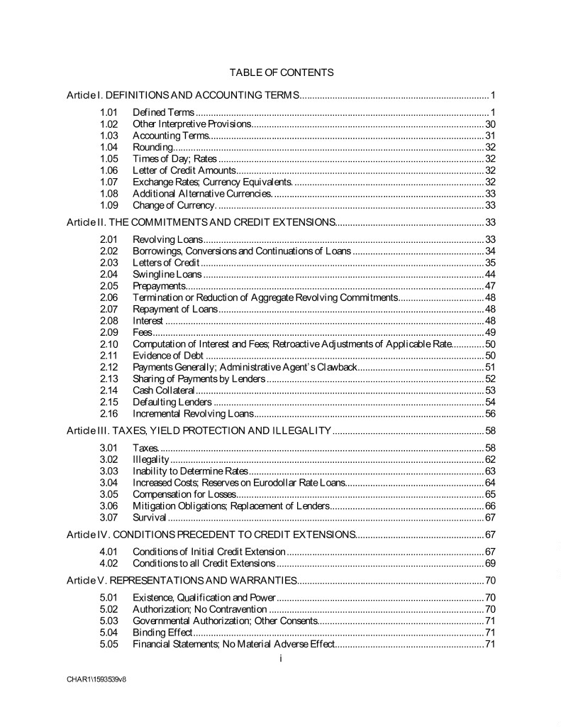 TABLE OF CONTENTS Article I. DEFINITIONS AND ACCOUNTING TERMS ........................................................................... 1 1.01 Defined Terms .................................................................................................................... 1 1.02 Other Interpretive Provisions ............................................................................................ 30 1.03 Accounting Terms ............................................................................................................. 31 1.04 Rounding ........................................................................................................................... 32 1.05 Times of Day; Rates ......................................................................................................... 32 1.06 Letter of Credit Amounts .................................................................................................. 32 1.07 Exchange Rates; Currency Equivalents. ........................................................................... 32 1.08 Additional Alternative Currencies. ................................................................................... 33 1.09 Change of Currency. ......................................................................................................... 33 Article II. THE COMMITMENTS AND CREDIT EXTENSIONS........................................................... 33 2.01 Revolving Loans ............................................................................................................... 33 2.02 Borrowings, Conversions and Continuations of Loans .................................................... 34 2.03 Letters of Credit ................................................................................................................ 35 2.04 Swingline Loans ............................................................................................................... 44 2.05 Prepayments ...................................................................................................................... 47 2.06 Termination or Reduction of Aggregate Revolving Commitments .................................. 48 2.07 Repayment of Loans ......................................................................................................... 48 2.08 Interest .............................................................................................................................. 48 2.09 Fees ................................................................................................................................... 49 2.10 Computation of Interest and Fees; Retroactive Adjustments of Applicable Rate............. 50 2.11 Evidence of Debt .............................................................................................................. 50 2.12 Payments Generally; Administrative Agent’s Clawback .................................................. 51 2.13 Sharing of Payments by Lenders ...................................................................................... 52 2.14 Cash Collateral .................................................................................................................. 53 2.15 Defaulting Lenders ........................................................................................................... 54 2.16 Incremental Revolving Loans ........................................................................................... 56 Article III. TAXES, YIELD PROTECTION AND ILLEGALITY ............................................................ 58 3.01 Taxes. ................................................................................................................................ 58 3.02 Illegality ............................................................................................................................ 62 3.03 Inability to Determine Rates ............................................................................................. 63 3.04 Increased Costs; Reserves on Eurodollar Rate Loans ....................................................... 64 3.05 Compensation for Losses .................................................................................................. 65 3.06 Mitigation Obligations; Replacement of Lenders ............................................................. 66 3.07 Survival ............................................................................................................................. 67 Article IV. CONDITIONS PRECEDENT TO CREDIT EXTENSIONS................................................... 67 4.01 Conditions of Initial Credit Extension .............................................................................. 67 4.02 Conditions to all Credit Extensions .................................................................................. 69 Article V. REPRESENTATIONS AND WARRANTIES .......................................................................... 70 5.01 Existence, Qualification and Power .................................................................................. 70 5.02 Authorization; No Contravention ..................................................................................... 70 5.03 Governmental Authorization; Other Consents .................................................................. 71 5.04 Binding Effect ................................................................................................................... 71 5.05 Financial Statements; No Material Adverse Effect........................................................... 71 i CHAR1\1593539v8