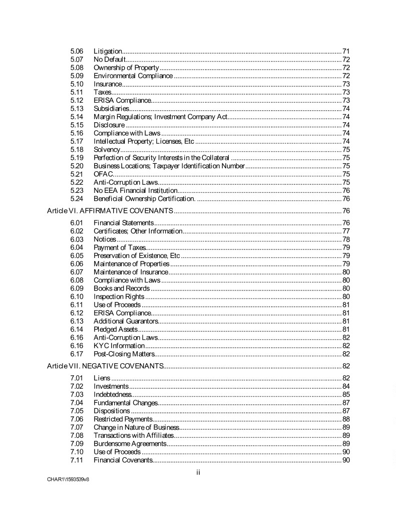5.06 Litigation ........................................................................................................................... 71 5.07 No Default......................................................................................................................... 72 5.08 Ownership of Property ...................................................................................................... 72 5.09 Environmental Compliance .............................................................................................. 72 5.10 Insurance ........................................................................................................................... 73 5.11 Taxes ................................................................................................................................. 73 5.12 ERISA Compliance ........................................................................................................... 73 5.13 Subsidiaries ....................................................................................................................... 74 5.14 Margin Regulations; Investment Company Act................................................................ 74 5.15 Disclosure ......................................................................................................................... 74 5.16 Compliance with Laws ..................................................................................................... 74 5.17 Intellectual Property; Licenses, Etc .................................................................................. 74 5.18 Solvency............................................................................................................................ 75 5.19 Perfection of Security Interests in the Collateral .............................................................. 75 5.20 Business Locations; Taxpayer Identification Number ...................................................... 75 5.21 OFAC. ............................................................................................................................... 75 5.22 Anti-Corruption Laws ....................................................................................................... 75 5.23 No EEA Financial Institution............................................................................................ 76 5.24 Beneficial Ownership Certification. ................................................................................. 76 Article VI. AFFIRMATIVE COVENANTS .............................................................................................. 76 6.01 Financial Statements ......................................................................................................... 76 6.02 Certificates; Other Information ......................................................................................... 77 6.03 Notices .............................................................................................................................. 78 6.04 Payment of Taxes .............................................................................................................. 79 6.05 Preservation of Existence, Etc .......................................................................................... 79 6.06 Maintenance of Properties ................................................................................................ 79 6.07 Maintenance of Insurance ................................................................................................. 80 6.08 Compliance with Laws ..................................................................................................... 80 6.09 Books and Records ........................................................................................................... 80 6.10 Inspection Rights .............................................................................................................. 80 6.11 Use of Proceeds ................................................................................................................ 81 6.12 ERISA Compliance ........................................................................................................... 81 6.13 Additional Guarantors ....................................................................................................... 81 6.14 Pledged Assets .................................................................................................................. 81 6.16 Anti-Corruption Laws ....................................................................................................... 82 6.16 KYC Information .............................................................................................................. 82 6.17 Post-Closing Matters ......................................................................................................... 82 Article VII. NEGATIVE COVENANTS .................................................................................................... 82 7.01 Liens ................................................................................................................................. 82 7.02 Investments ....................................................................................................................... 84 7.03 Indebtedness...................................................................................................................... 85 7.04 Fundamental Changes ....................................................................................................... 87 7.05 Dispositions ...................................................................................................................... 87 7.06 Restricted Payments .......................................................................................................... 88 7.07 Change in Nature of Business ...........................................................