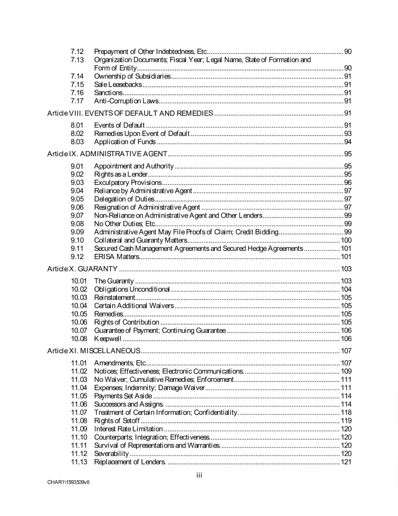7.12 Prepayment of Other Indebtedness, Etc ............................................................................ 90 7.13 Organization Documents; Fiscal Year; Legal Name, State of Formation and Form of Entity ................................................................................................................... 90 7.14 Ownership of Subsidiaries ................................................................................................ 91 7.15 Sale Leasebacks ................................................................................................................ 91 7.16 Sanctions ........................................................................................................................... 91 7.17 Anti-Corruption Laws ....................................................................................................... 91 Article VIII. EVENTS OF DEFAULT AND REMEDIES ........................................................................ 91 8.01 Events of Default .............................................................................................................. 91 8.02 Remedies Upon Event of Default ..................................................................................... 93 8.03 Application of Funds ........................................................................................................ 94 Article IX. ADMINISTRATIVE AGENT .................................................................................................. 95 9.01 Appointment and Authority .............................................................................................. 95 9.02 Rights as a Lender ............................................................................................................. 95 9.03 Exculpatory Provisions ..................................................................................................... 96 9.04 Reliance by Administrative Agent .................................................................................... 97 9.05 Delegation of Duties ......................................................................................................... 97 9.06 Resignation of Administrative Agent ............................................................................... 97 9.07 Non-Reliance on Administrative Agent and Other Lenders ............................................. 99 9.08 No Other Duties; Etc ......................................................................................................... 99 9.09 Administrative Agent May File Proofs of Claim; Credit Bidding .................................... 99 9.10 Collateral and Guaranty Matters ..................................................................................... 100 9.11 Secured Cash Management Agreements and Secured Hedge Agreements .................... 101 9.12 ERISA Matters ................................................................................................................ 101 Article X. GUARANTY ........................................................................................................................... 103 10.01 The Guaranty .................................................................................................................. 103 10.02 Obligations Unconditional .............................................................................................. 104 10.03 Reinstatement .................................................................................................................. 105 10.04 Certain Additional Waivers ............................................................................................ 105 10.05 Remedies ......................................................................................................................... 105 10.06 Rights of Contribution .................................................................................................... 105 10.07 Guarantee of Payment; Continuing Guarantee ............................................................... 106 10.08 Keepwell ......................................................................................................................... 106 Article XI. MISCELLANEOUS ............................................................................................................... 107 11.01 Amendments, Etc ............................................................................................................ 107 11.02 Notices; Effectiveness; Electronic Communications. ..................................................... 109 11.03 No Waiver; Cumulative Remedies; Enforcement ........................................................... 111 11.04 Expenses; Indemnity; Damage Waiver ........................................................................... 111 11.05 Payments Set Aside ........................................................................................................ 114 11.06 Successors and Assigns. ................................................................................................. 114 11.07 Treatment of Certain Information; Confidentiality. ........................................................ 118 11.08 Rights of Setoff ............................................................................................................... 119 11.09 Interest Rate Limitation .................................................................................................. 120 11.10 Counterparts; Integration; Effectiveness ......................................................................... 120 11.11 Survival of Representations and Warranties. .................................................................. 120 11.12 Severability ..................................................................................................................... 120 11.13 Replacement of Lenders. ...........................................................